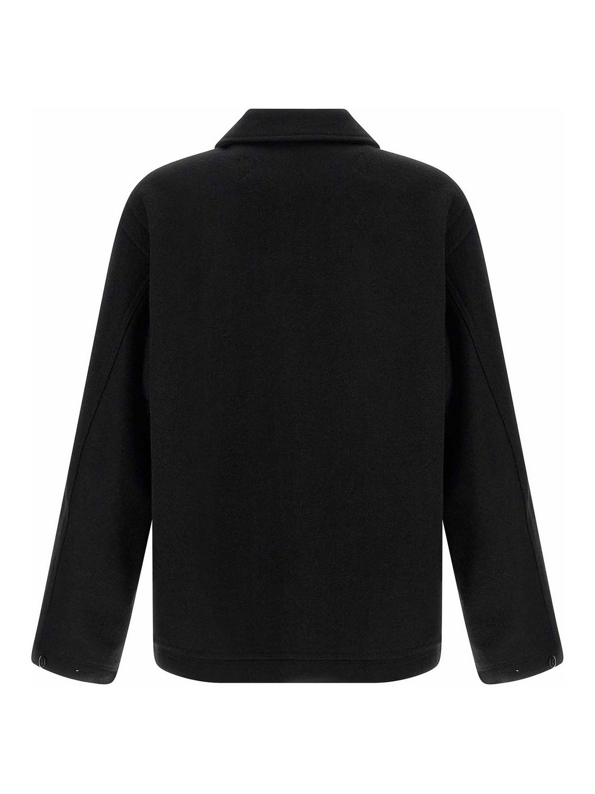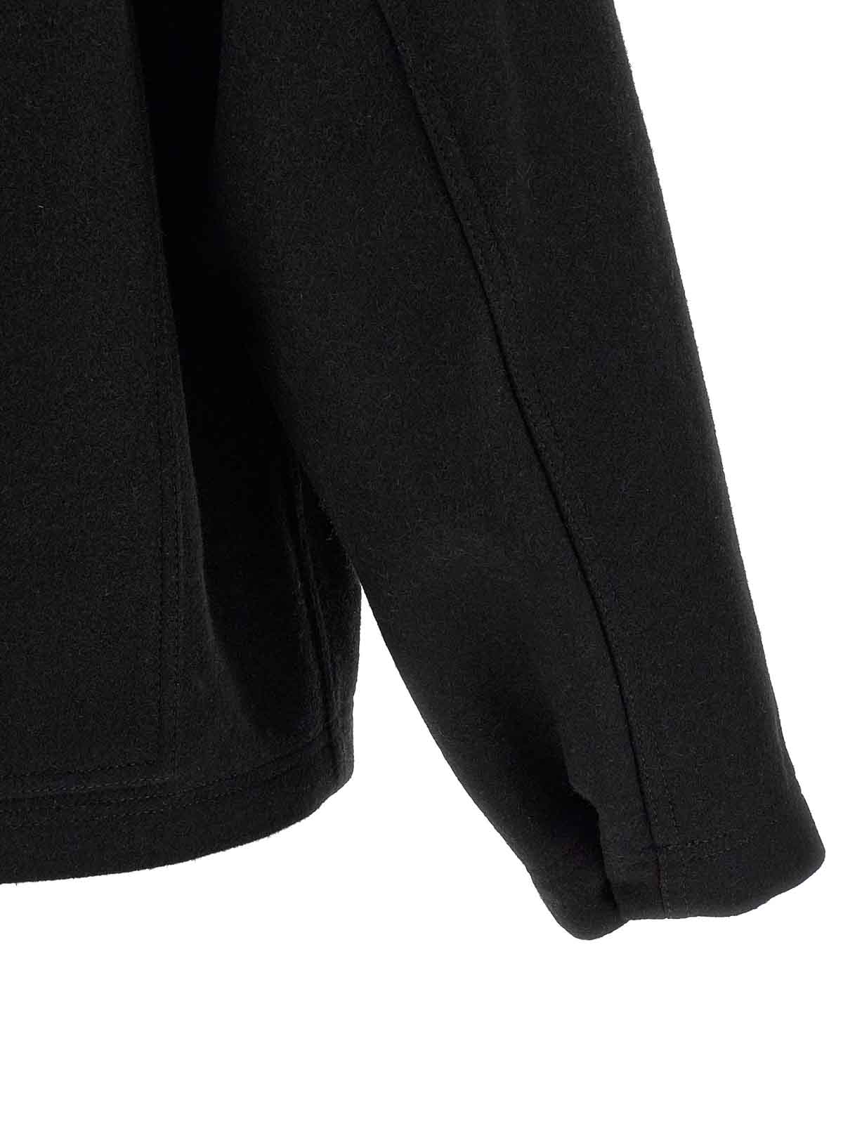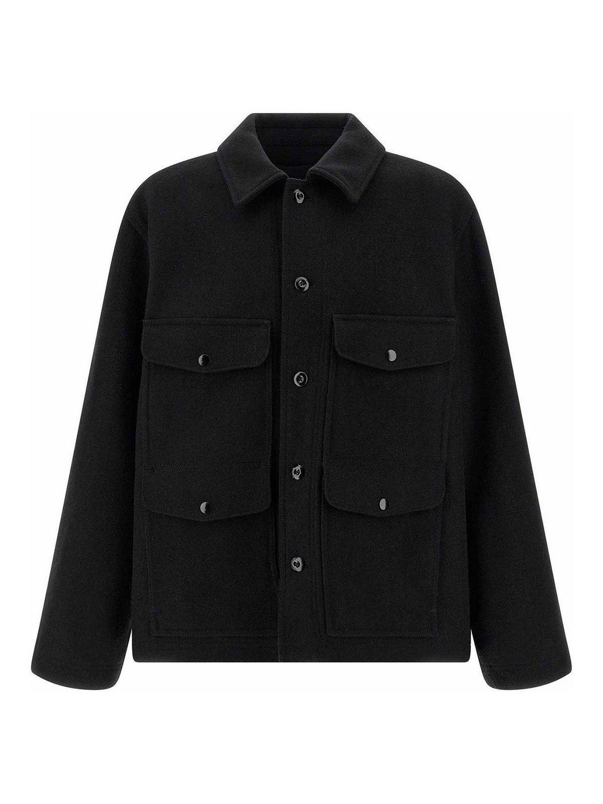 Melton wool jacket, multi-pocket 'utility' style, shirt collar, front button closure, long sleeves, unlined.