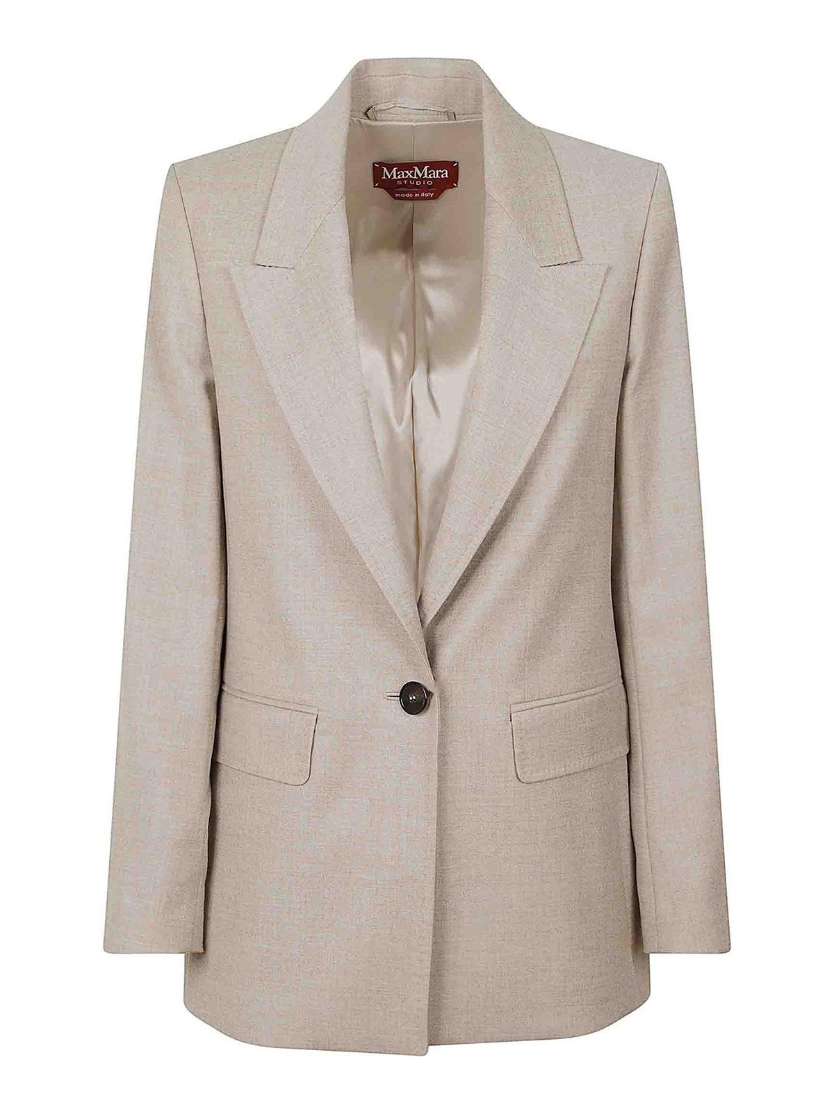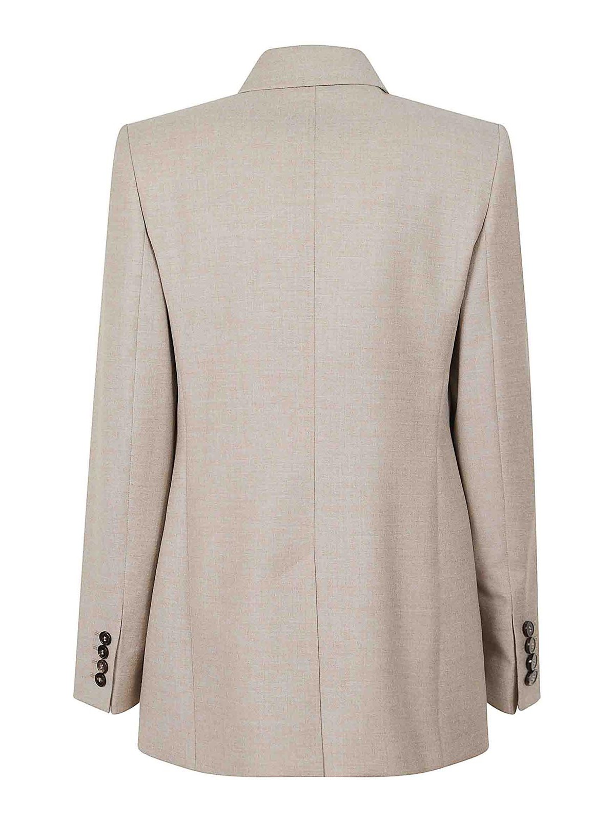 Beige stretch wool blazer jacket, single-breasted button fastening, peak lapels, welt pockets with flap, central rear vent, tailored stitching.