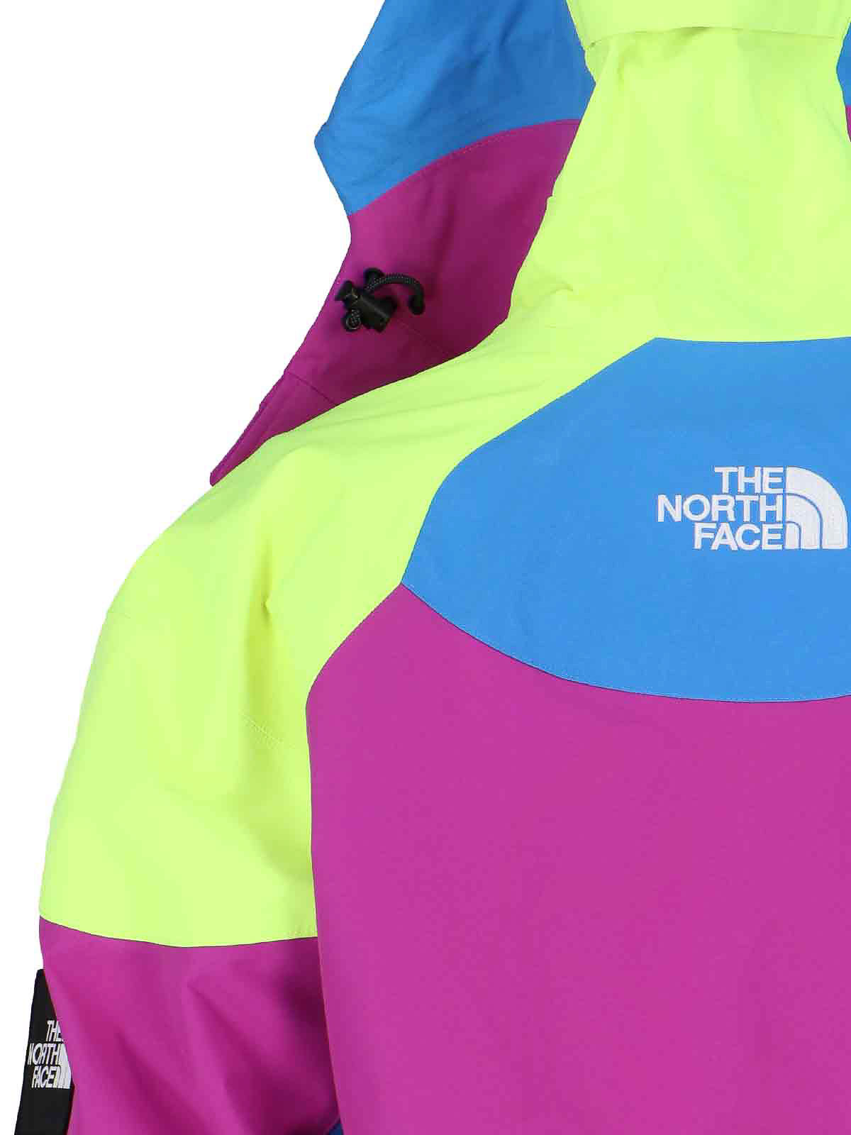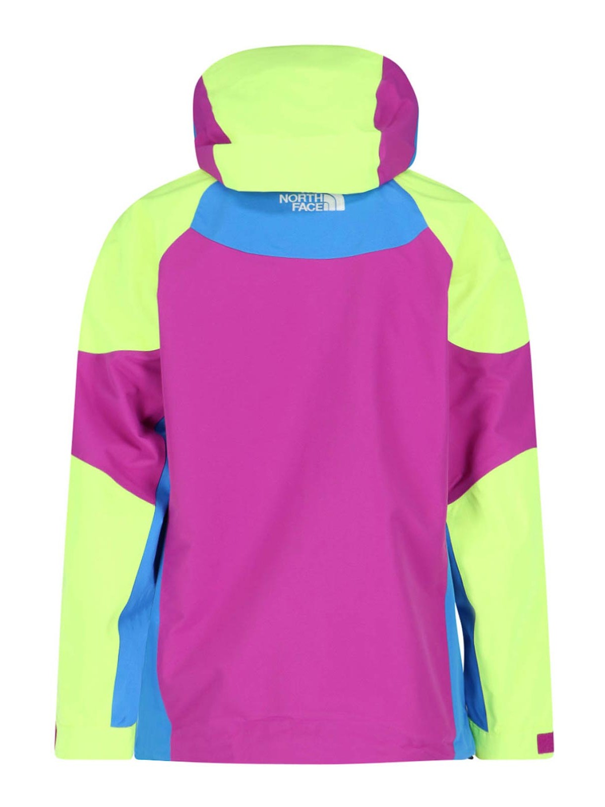 The north face color block jacket multicolor panels drawstring hood white patch zip front and back logo two chest zip pockets two side pockets black logo label adjustable cuffs drawstring hem straight hem