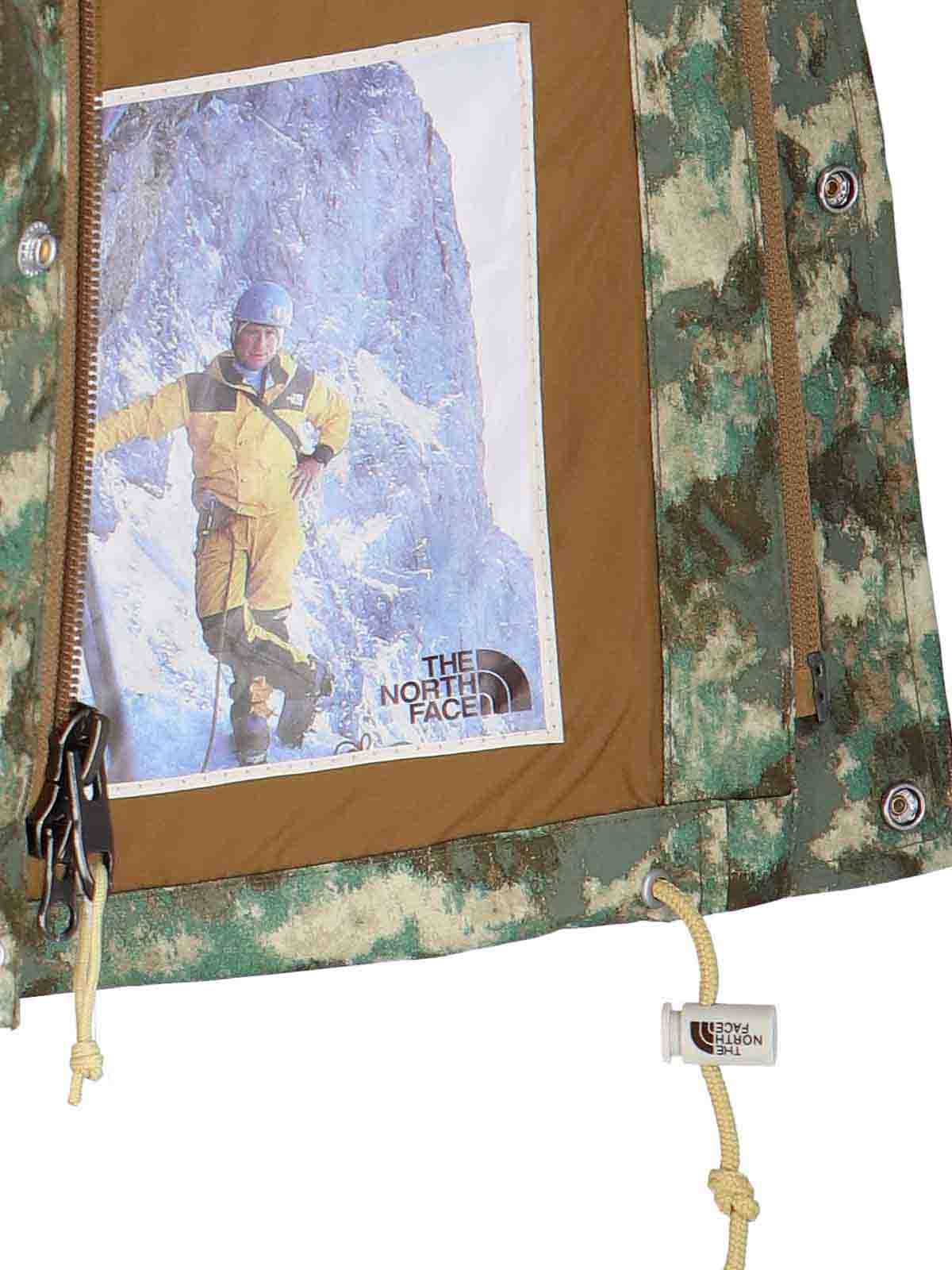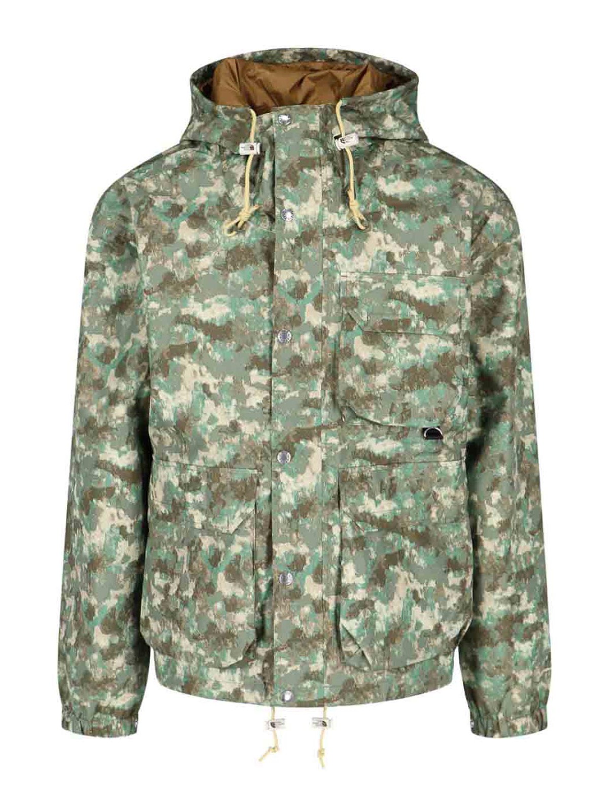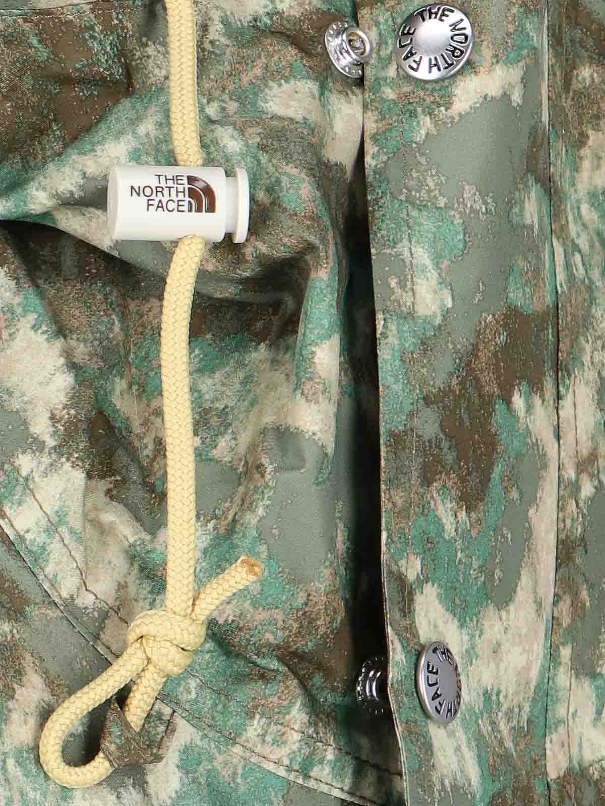 The north face utility rain jacket with camouflage print high collar hood drawstring zip and buttons one chest pocket two maxi front pockets elastic cuffs drawstring at the bottom