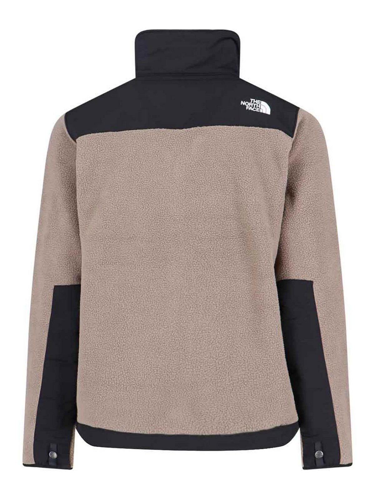 The north face retro denali jacket, in brown fleece, light tone, high collar, zip closure, contrasting black panel on front and back, two chest zip pockets, chest logo detail, two side zip pockets, contrasting panels applied on the elbows, straight hem.