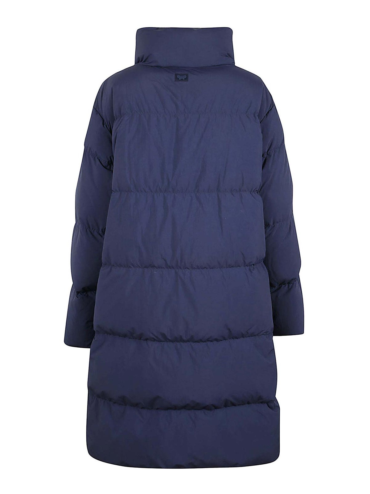 Blue nylon down jacket, down padding, snap button fastening, flap pockets, side collar.