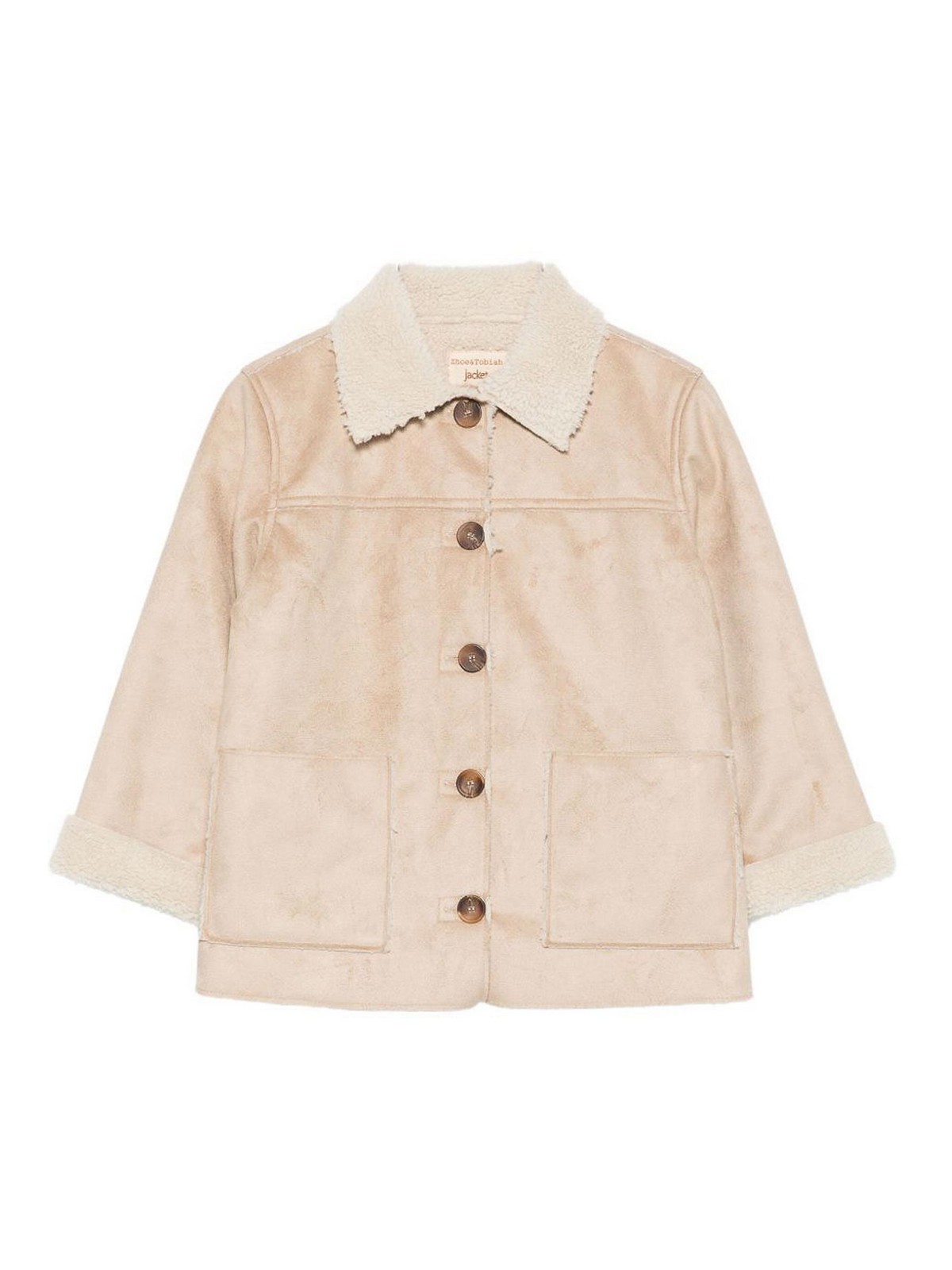 Buttoned jacket features beige faux collar and buttoned cuffs patch pockets on