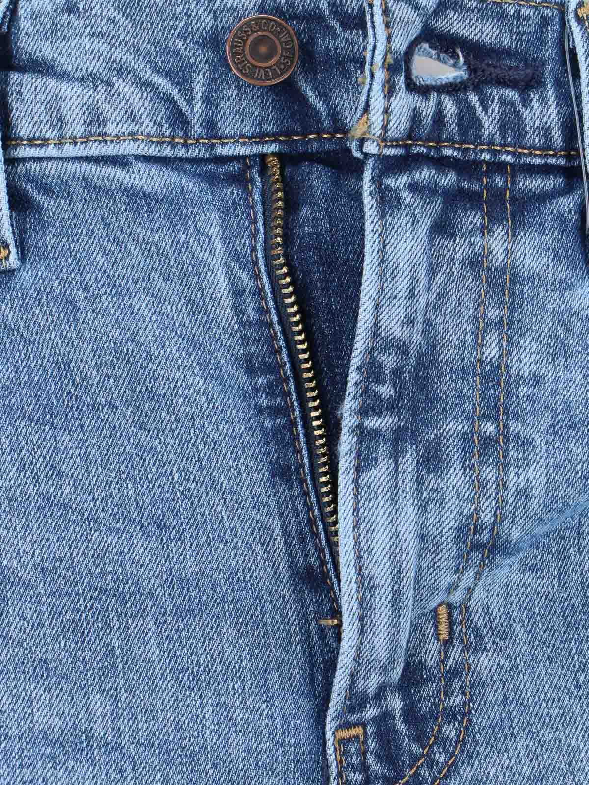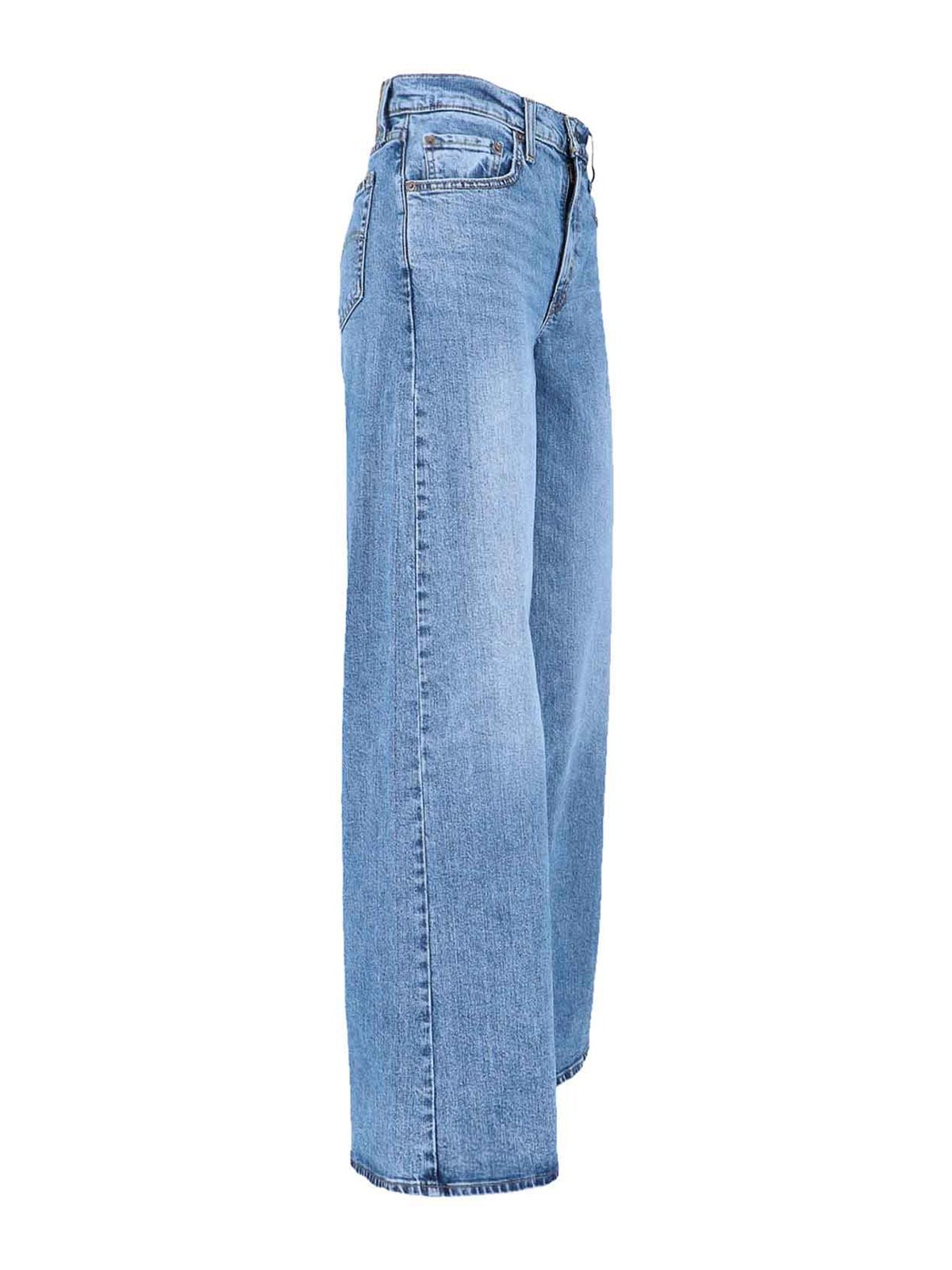 Levi's Strauss 728 wide jeans, in light blue denim, worn wash, high waist, belt loops, button and zip closure, five pocket design, rear logo patch, wide leg.