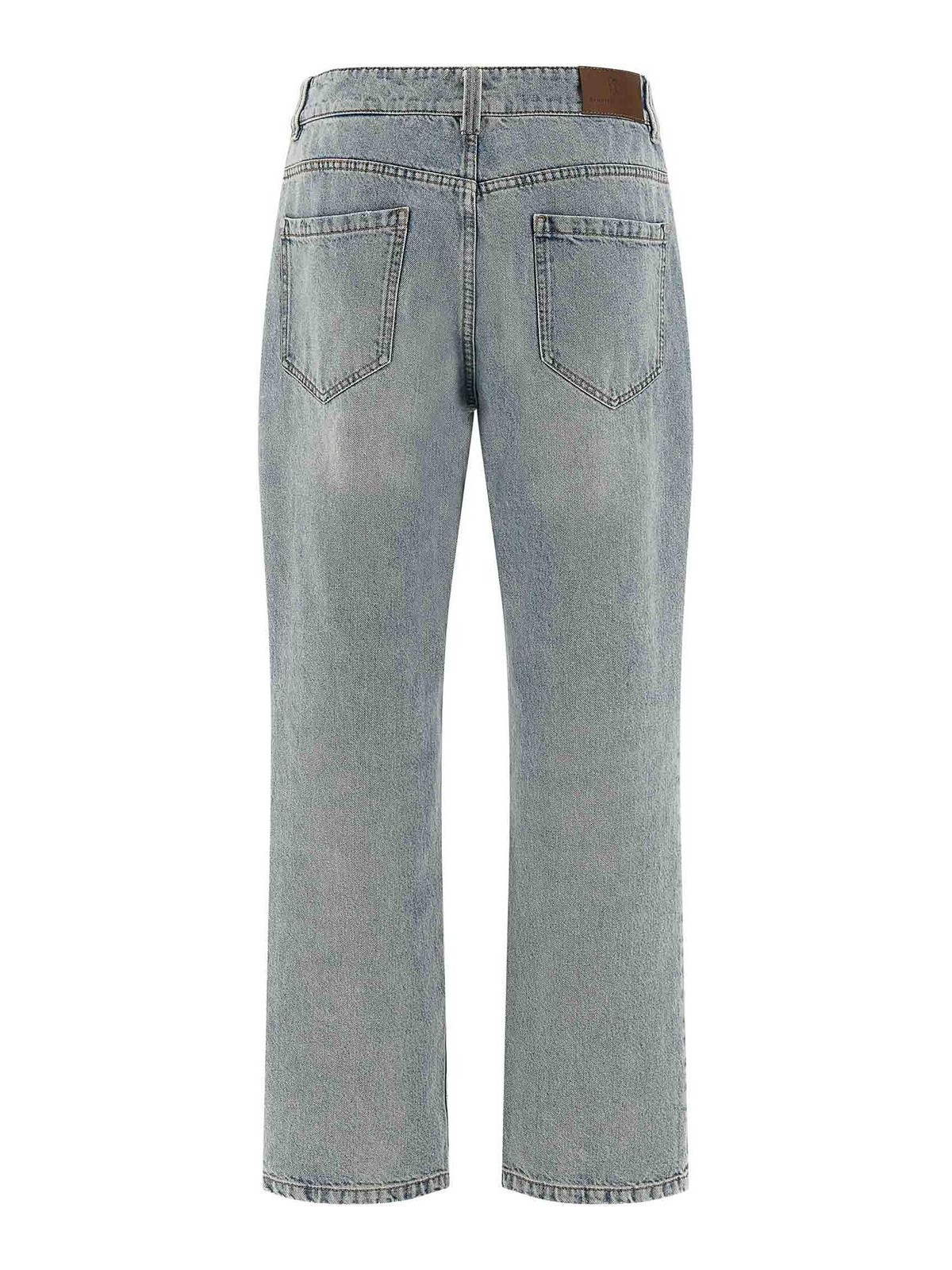 Authentic denim 'retro' jeans characterized by slight shades of vintage-effect color, crop model with relaxed volumes and slightly lowered crotch, high waist, straight leg, front zip and button closure, five pockets, leather logo tag and monile detail at the back.