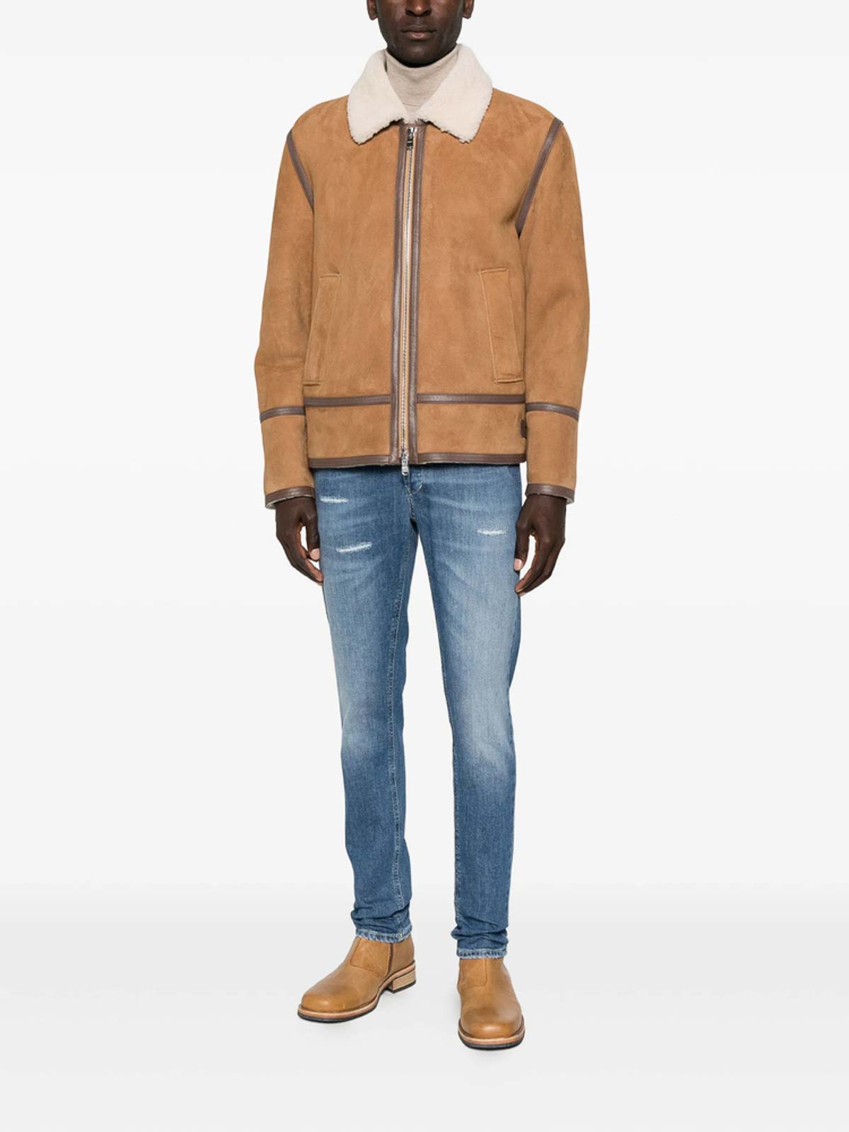 Blue distressed effect whiskering at the thighs five pockets button belt loops