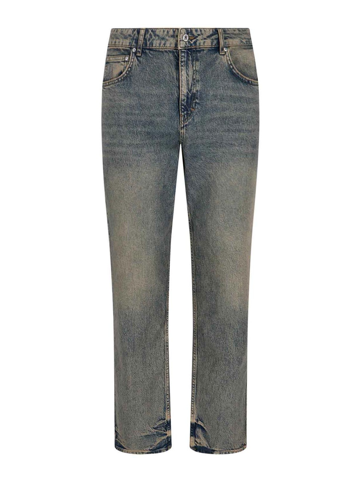 Straight represent jeans, in blue cotton denim, worn effect, medium waist, belt loops, five pocket design, button and zip closure, silver metal logo detail, straight leg.