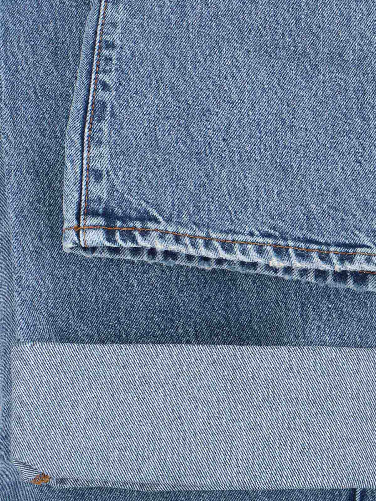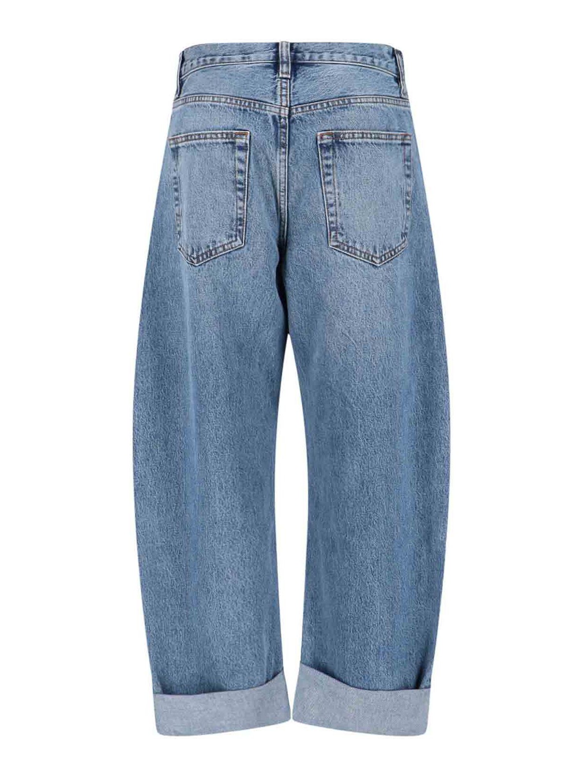 The bubble frame jeans, in light blue cotton denim, worn wash, high waist, belt loops, button closure, five pocket design, adjustable turn-up detail, straight leg.