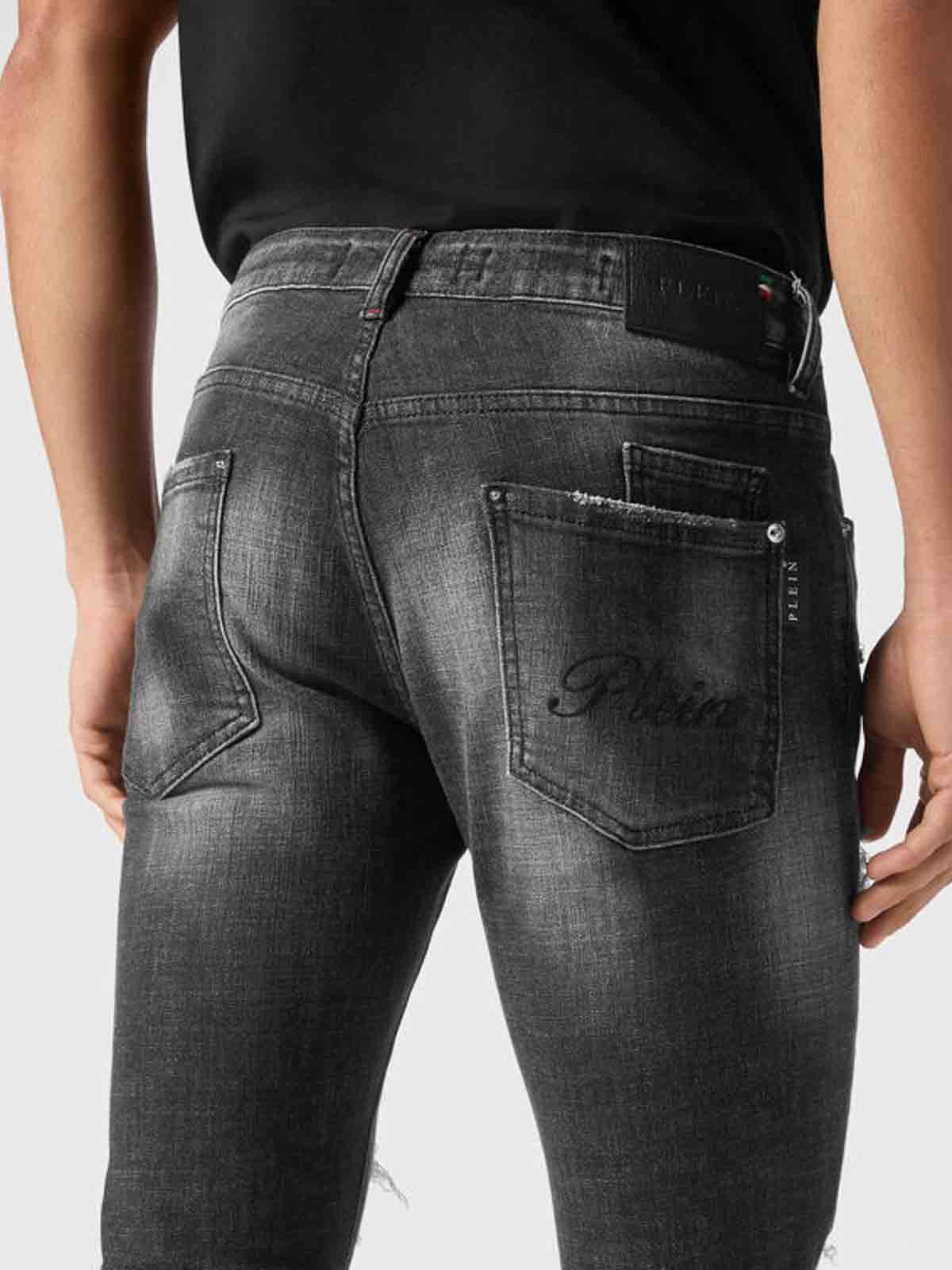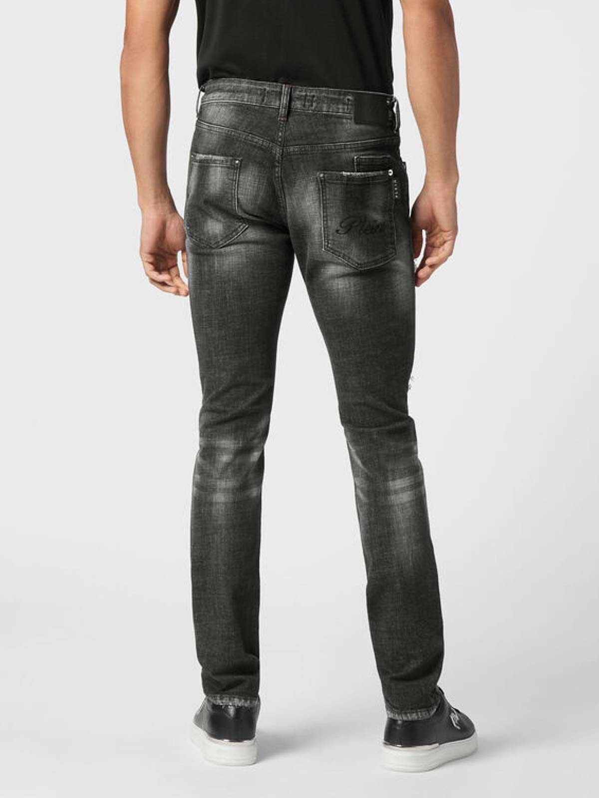 Cotton blend denim trousers by philipp plein. featuring a wash with wear and tear . the rips are patched with denim inserts . stitched logo patch on the back pocket adjustable metal button fastening . super straight fit