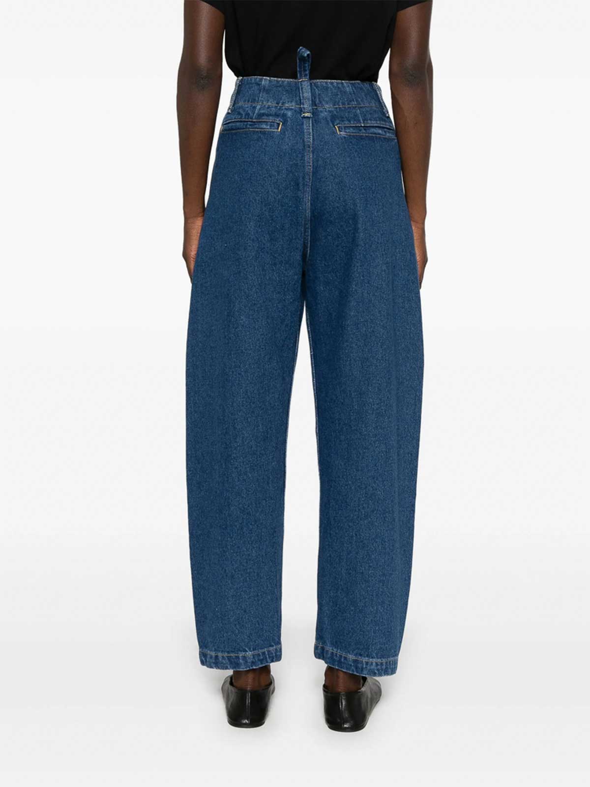 Indigo blue blend washed denim button and zip stitching mid, rise belt loops two diagonal pockets to the sides two rear welt pockets tapered leg