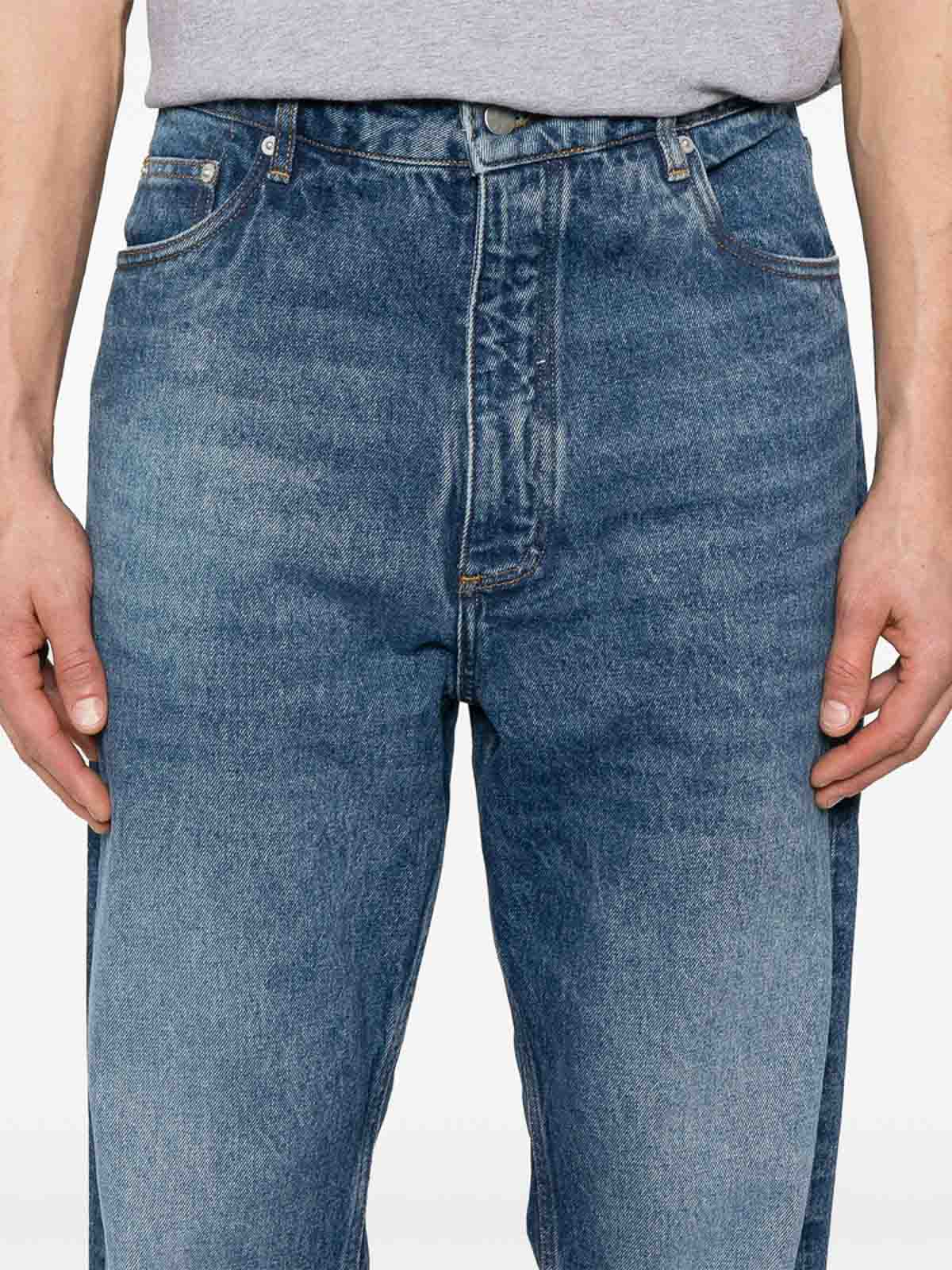 Indigo blue button and zip belt loops classic five pockets logo patch to the rear