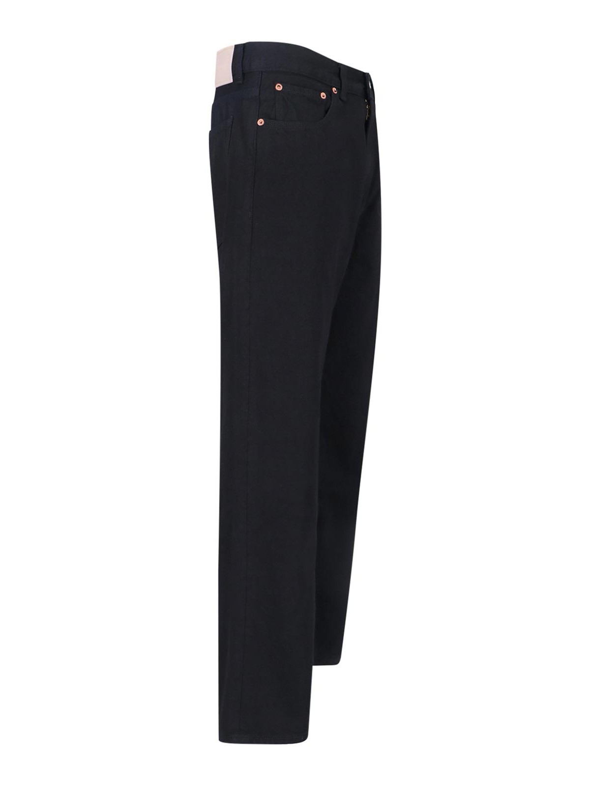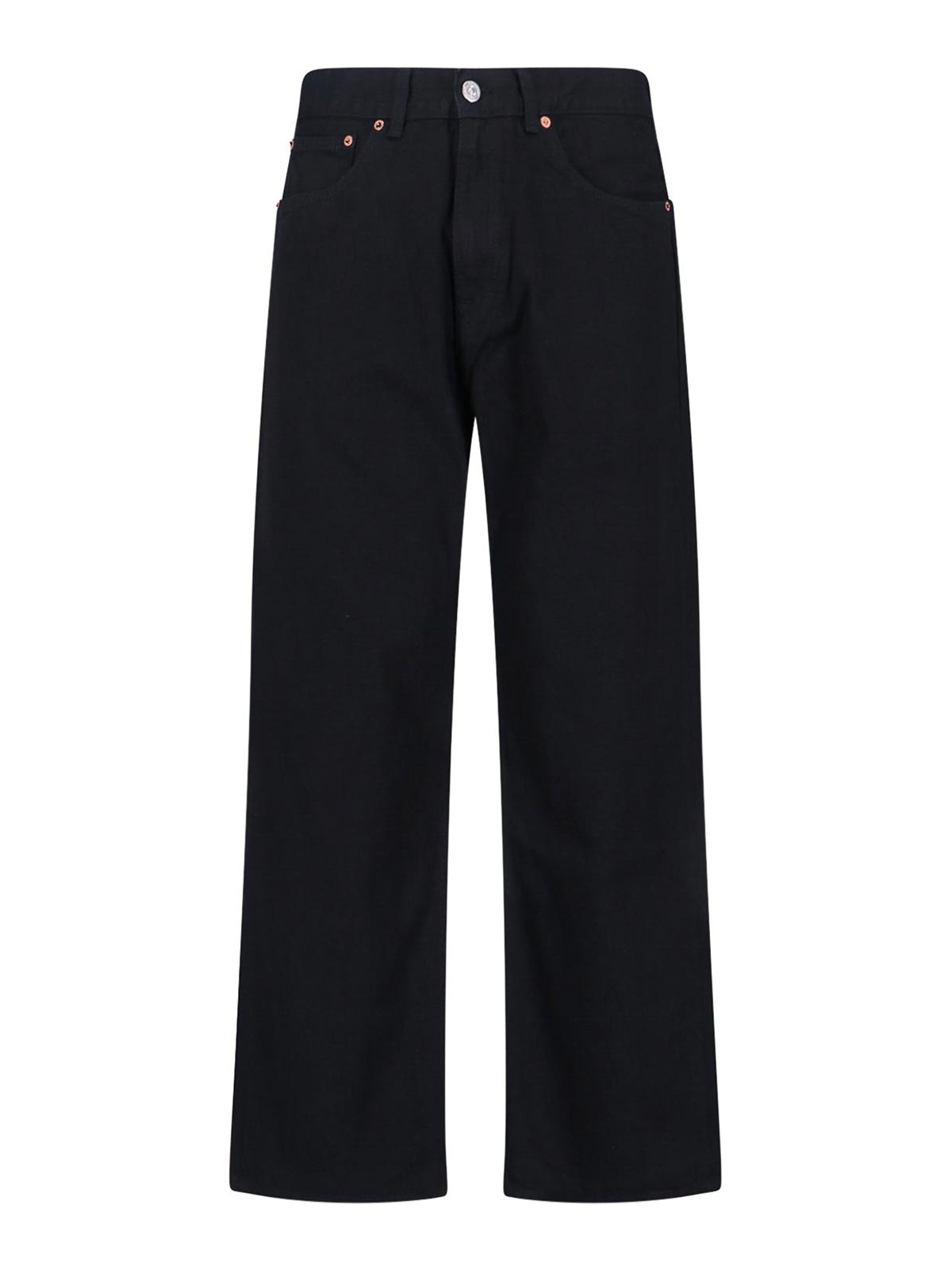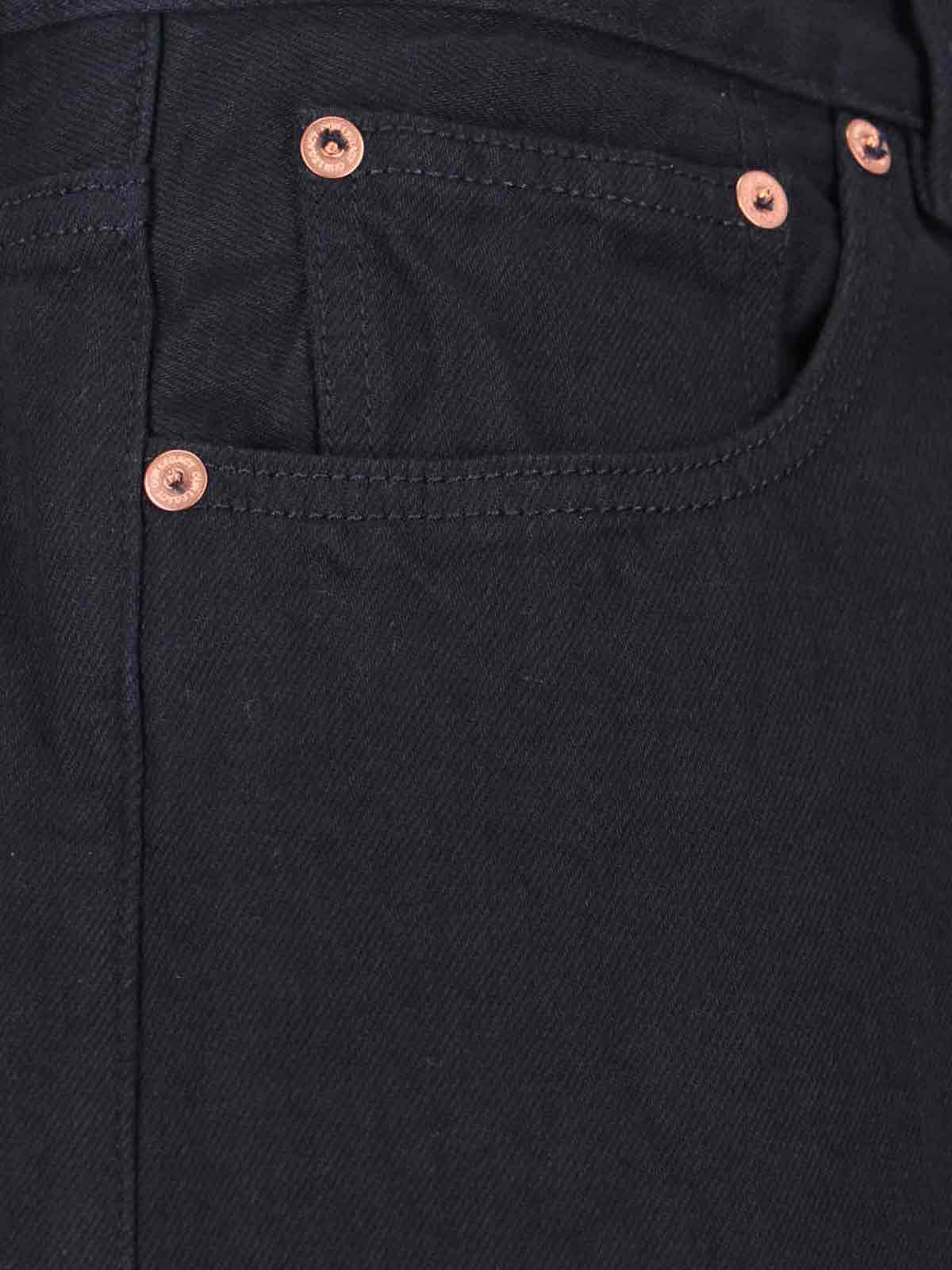 Third cut our legacy jeans, in black denim, medium waist, belt loops, button and zip closure, five pocket design, rear logo label, wide leg.