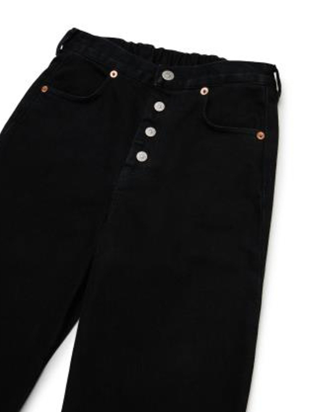 Button up jeans features black button structure five pocket design back patch pockets back logo appliqué