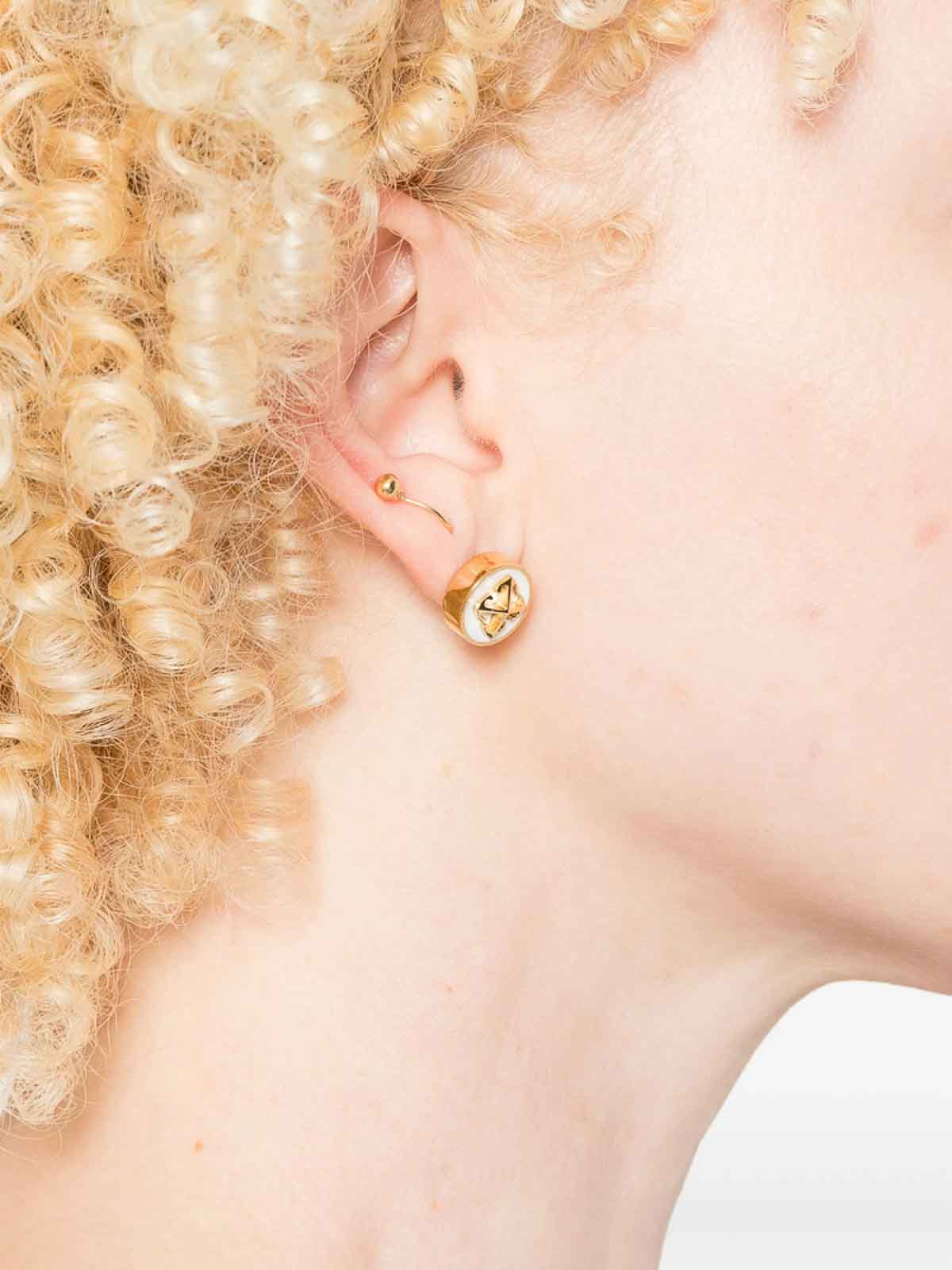 Gold, tone polished finish circular design signature arrows motif post, back these earrings come as a pair