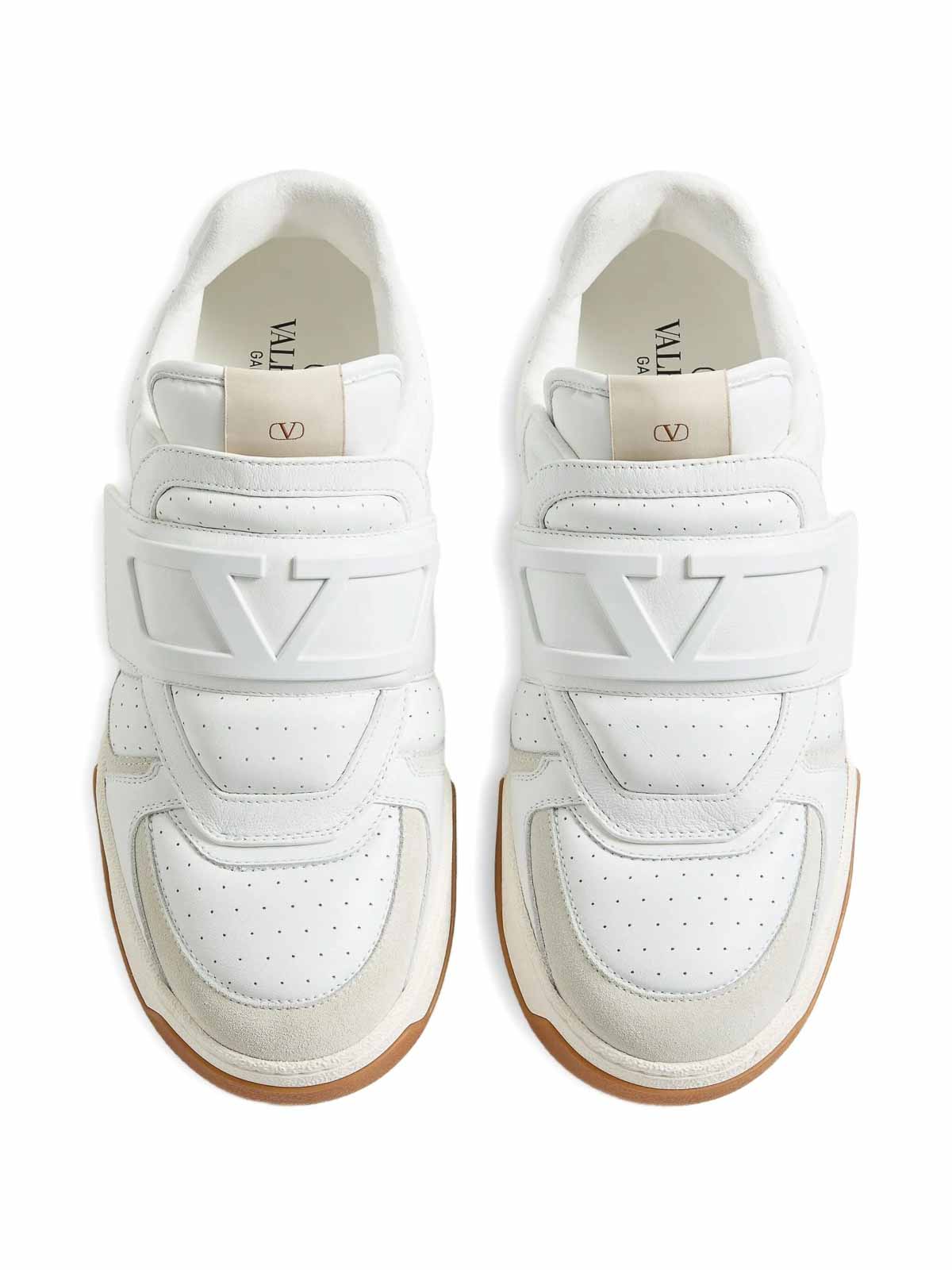 designer color: white, calf leather, perforated detailing, internal lace-up closure, velcro closure to the front, signature vlogo detail, contrasting gum sole, ankle padding.