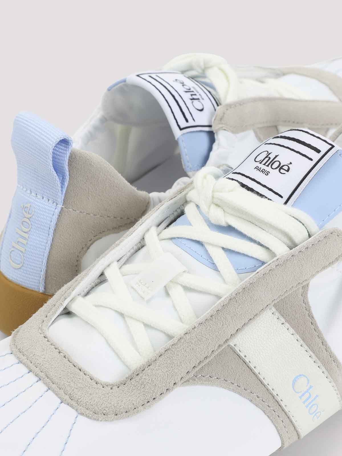Chloe dreamy blue leather kick sneakers. crafted in nylon, leather and tpu. round toe, top lace-up fastening, dreamy blue tongue, patch logo on the tongue, white and grey details on the upper, back dreamy blue strap, brown tpu sole.
