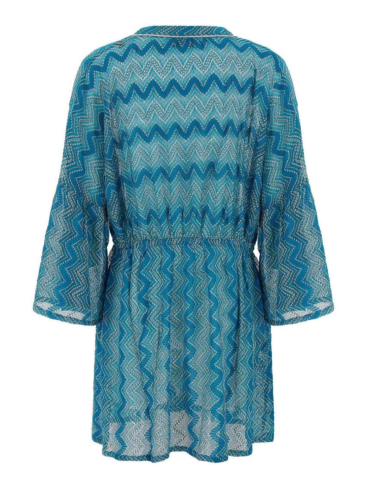 Mini dress, semi-transparent openwork knit zigzag, v-neck, short bat sleeves, elastic waistband.