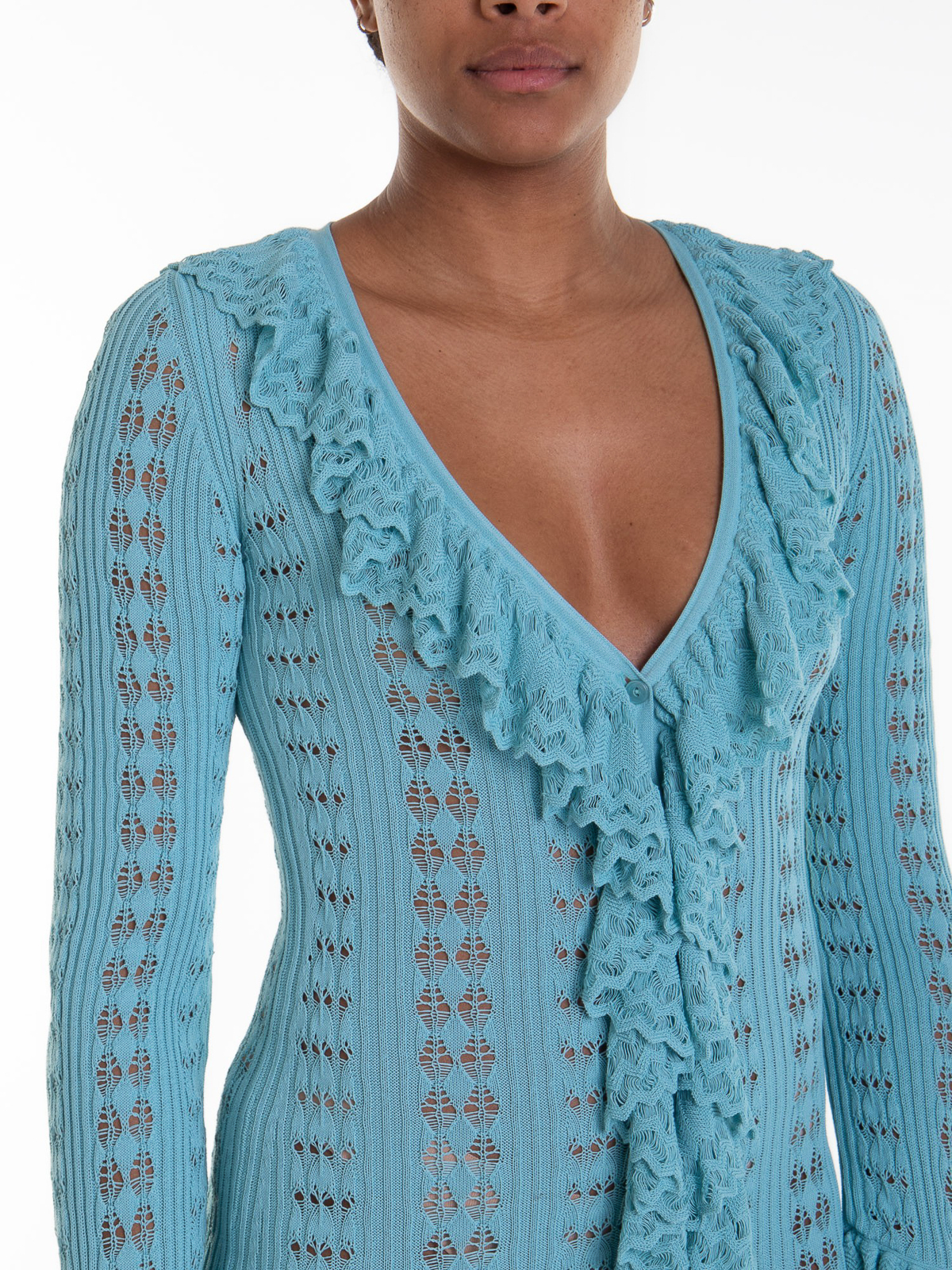Knitted dress with ruffles, slim fit, wide neck, long sleeves, buttons closure.