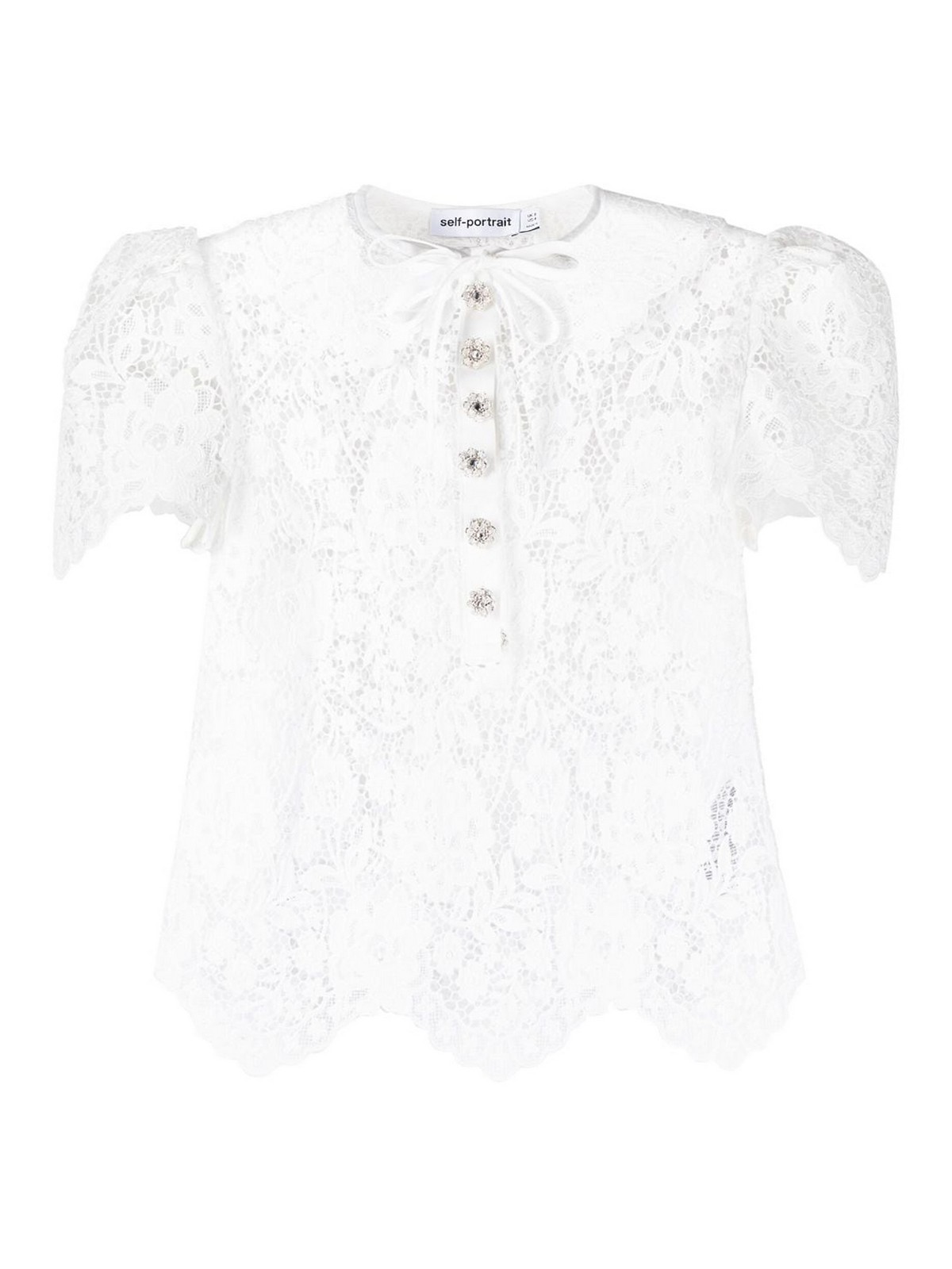 Self portrait floral lace top with semi sheer construction crystal embellished buttons bow scalloped collar short sleeves scalloped hem white and floral lace