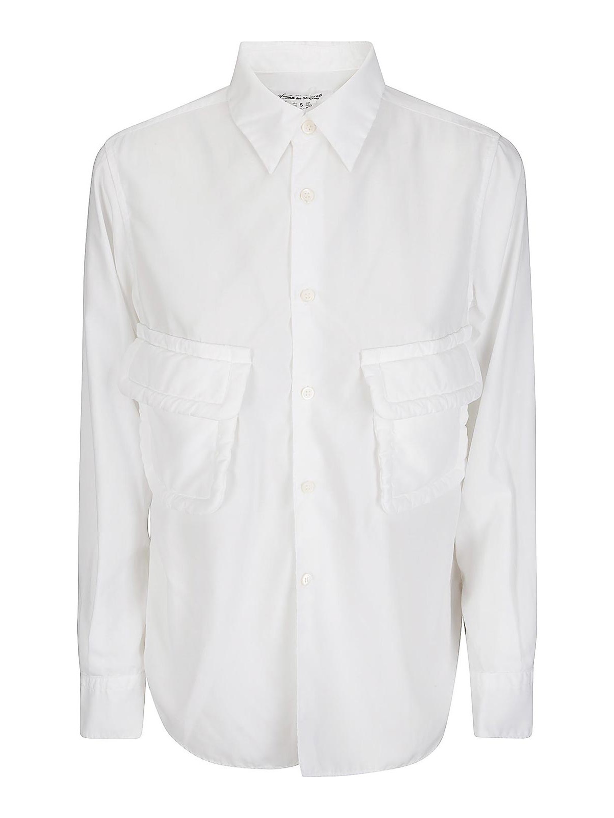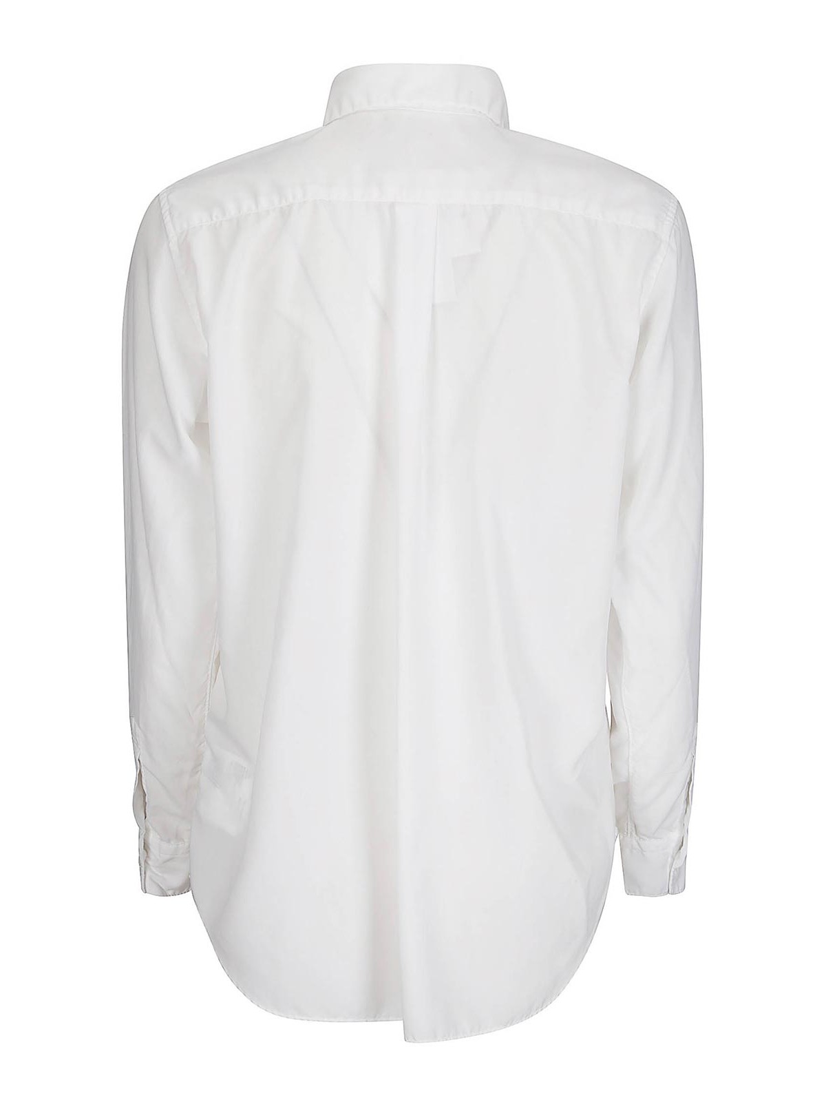 Shirt with classic collar, fastening with a row of mother-of-pearl buttons, large bellows pockets placed symmetrically at chest level,