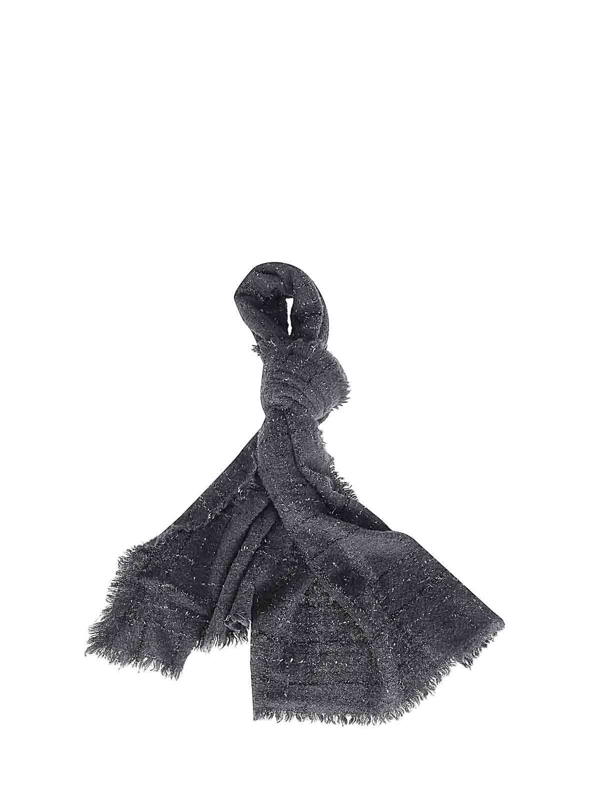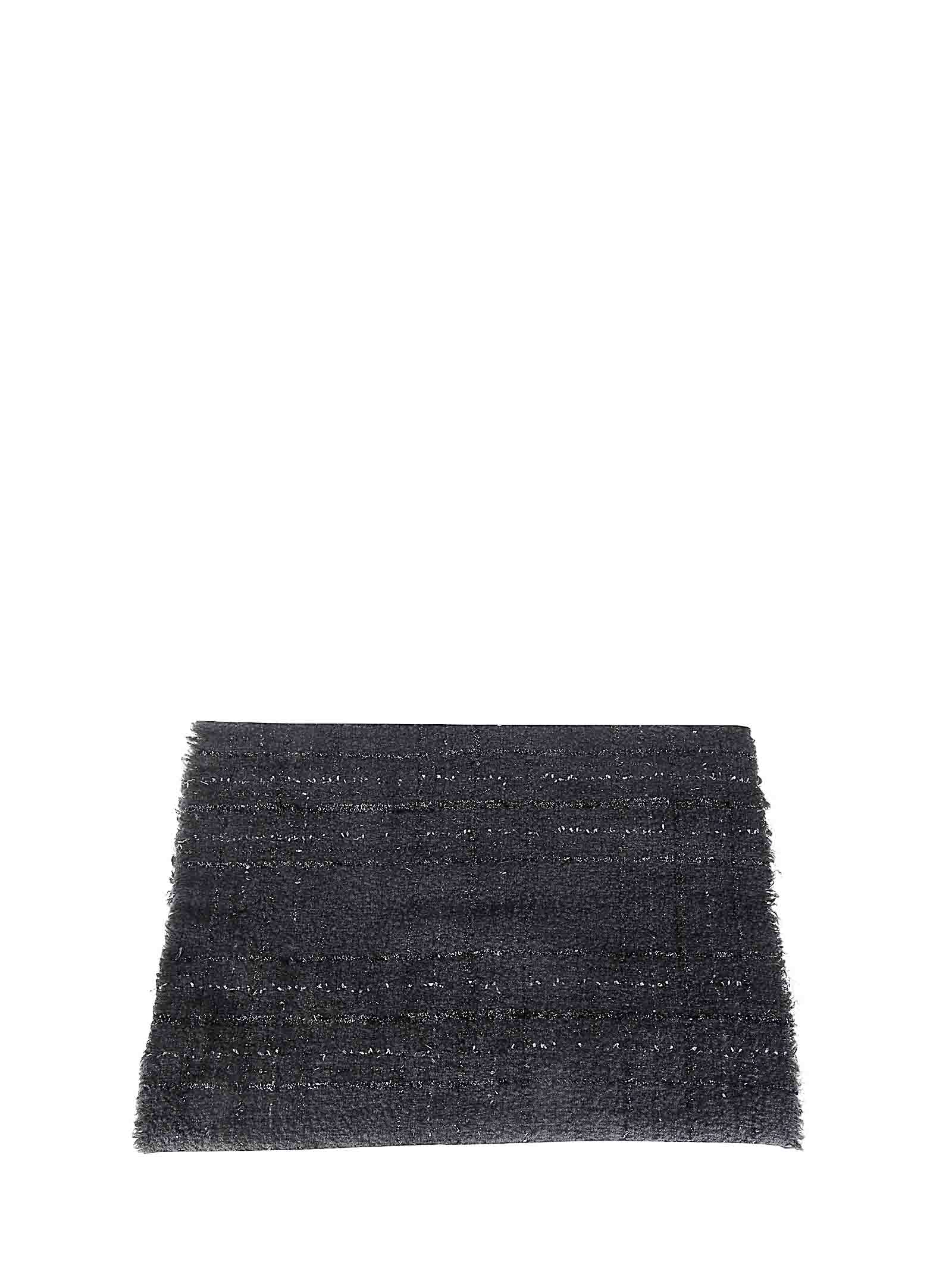 Large wool blend scarf, with lurex inserts and jagged edges.