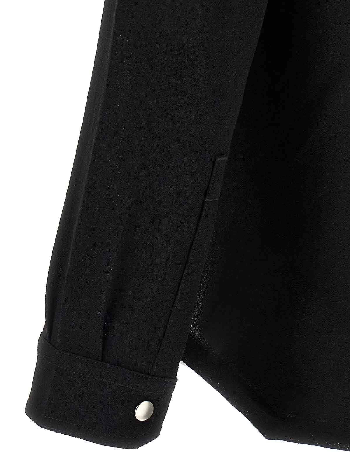 larry fogpocket' medium weight wool shirt woven with high twist frizzy yarns, front snap button closure, v-neck, pockets, long cuffed sleeves.