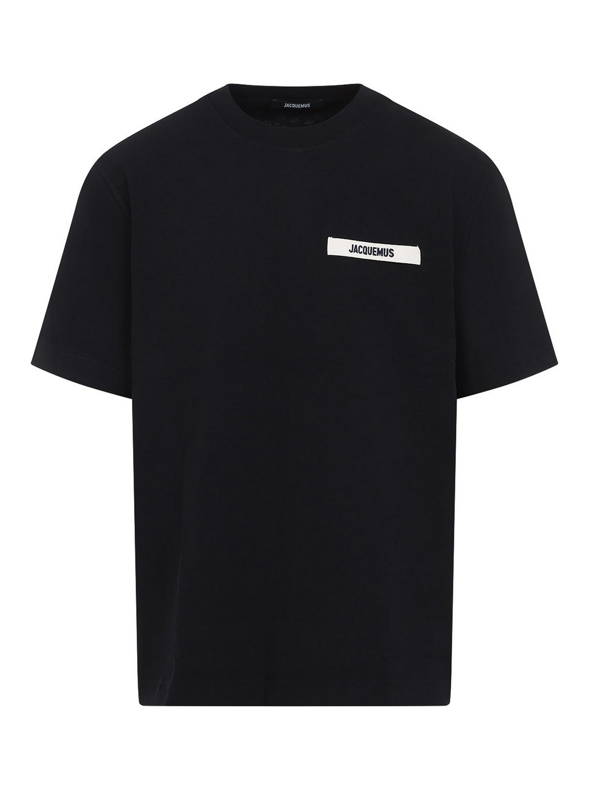 Jacquemus black cotton le t-shirt grosgrain t-shirt. pure black cotton t-shirt, round neck, chest patch logo, short sleeves, straight hem, tonal stitching.