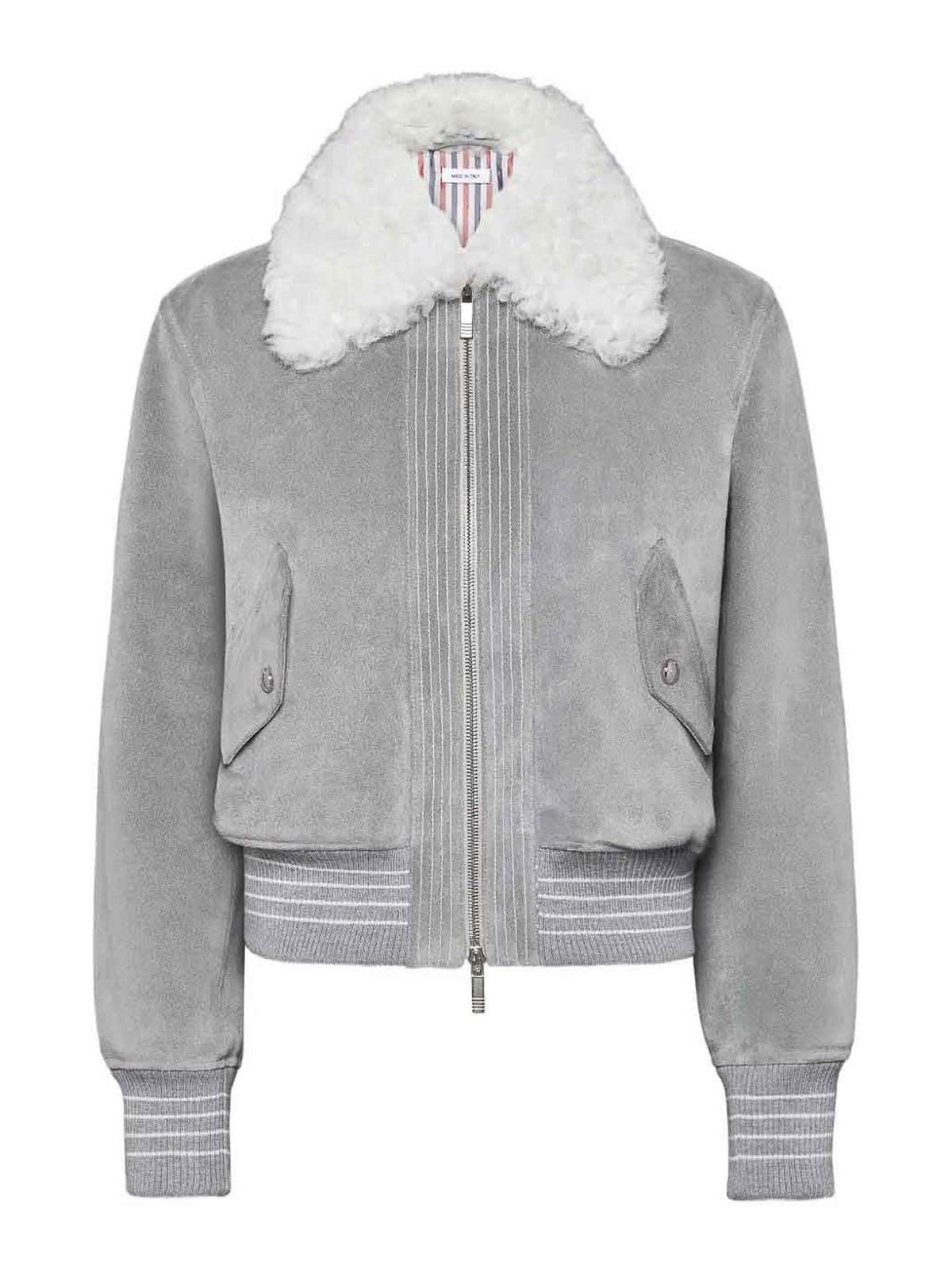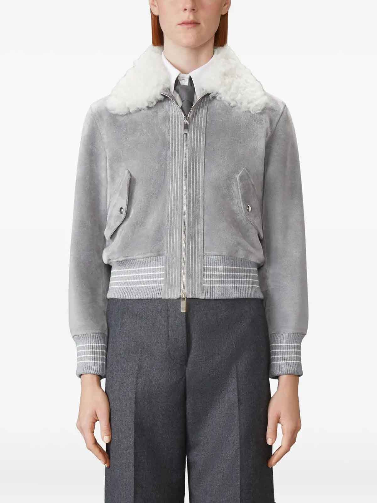 Medium grey, shearling collar, front zip fastening, ribbed hem, side flap pockets