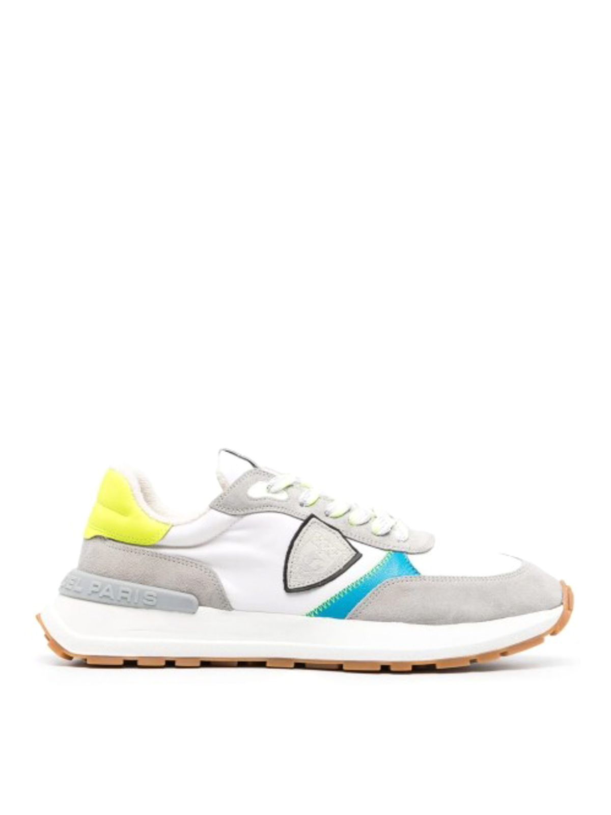 Color block lace up sneakers by philippe model paris featuring white/multicolor calf leather calf suede design logo patch on tongue logo patch on tongue contrast heel counter lace up front closure in logo and flat origin italy
