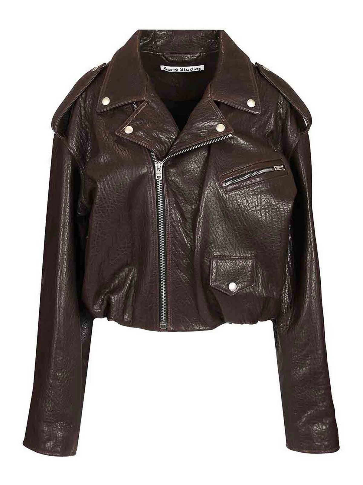 Acne studios leather biker jacket crafted from tooled leather with silver-tone metal detailing, featuring dropped shoulders, an elasticated hem below the waist, a front zip fastening and fully lined.