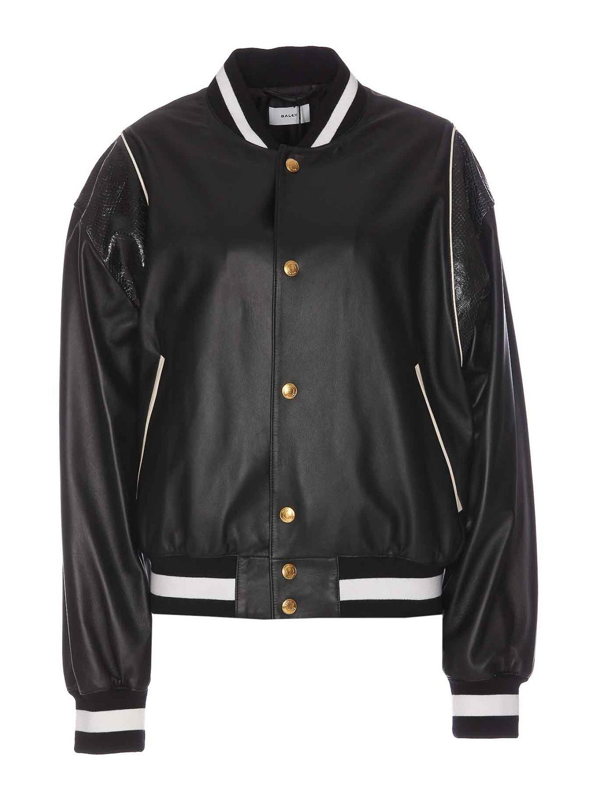 Bally black leather jacket with frontal buttons closure lateral pockets elasticized cuffs and on waist python print detail l sleeves