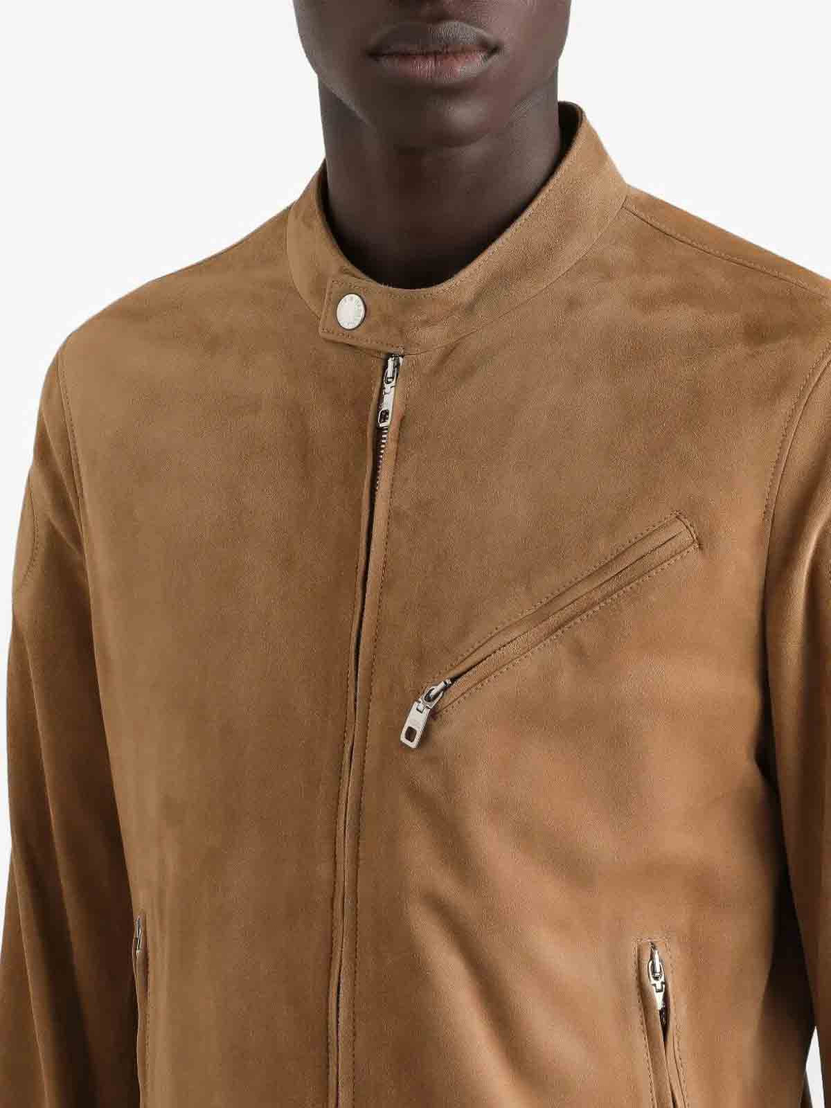Leather jacket characterized by a smooth texture, front closure and defined structure for a strong look.