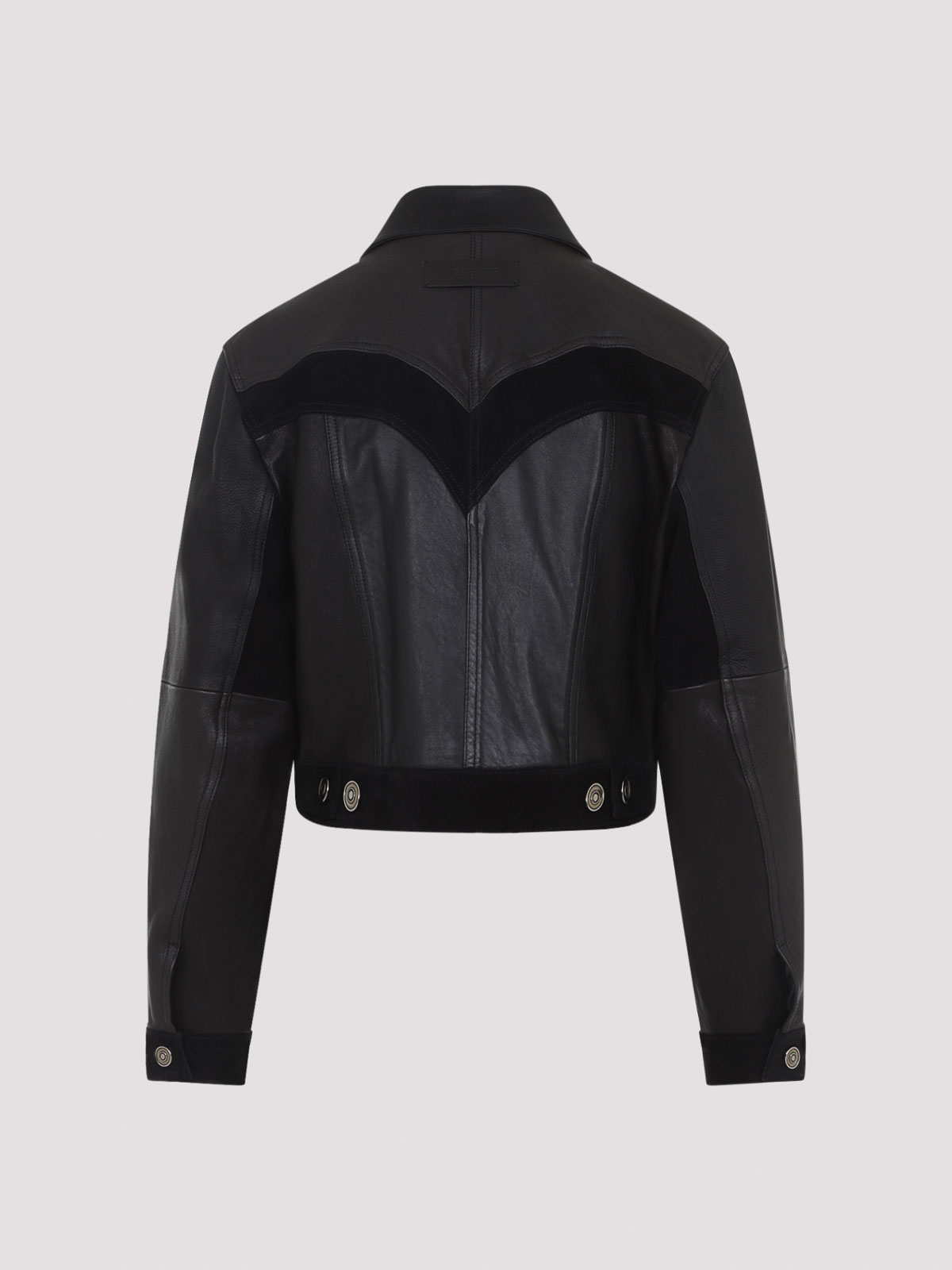 Versace black lamb leather jacket. pure black lamb leather jacket, pointed collar, front buttoned fastening, chest flap buttoned pockets, long sleeves, buttoned cuffs, straight hem. tonal suede leather details all-over.