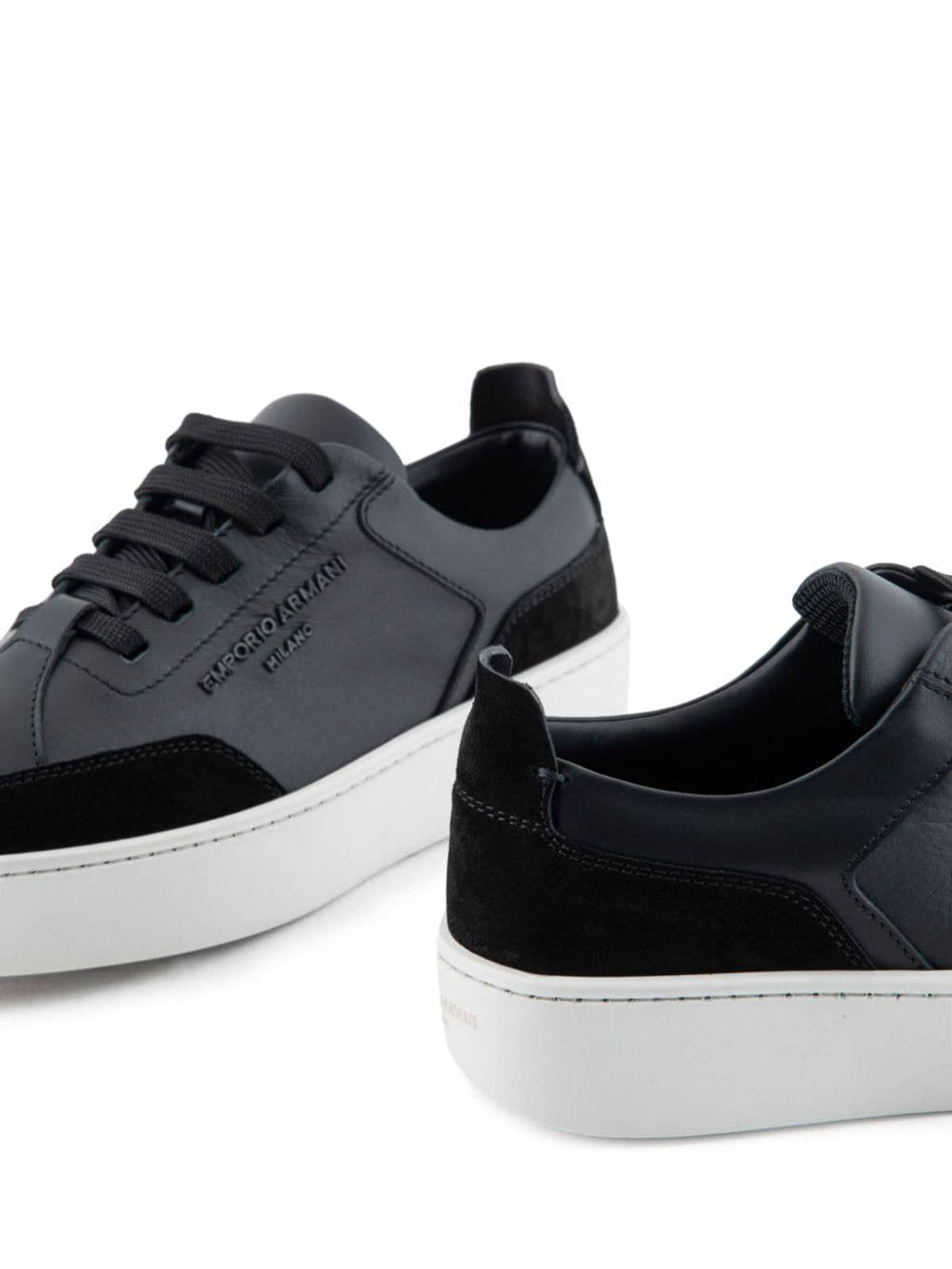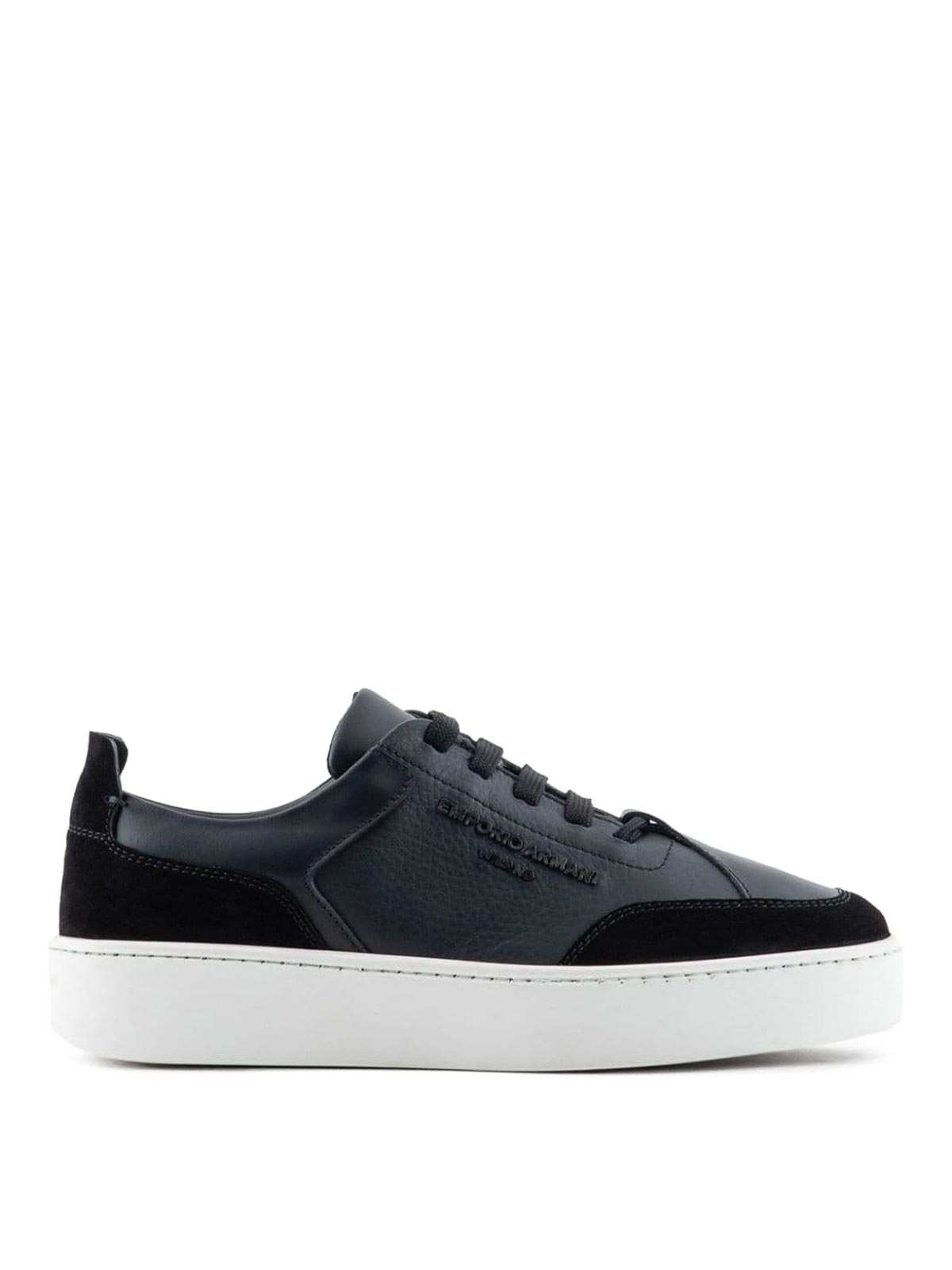 Logo-plaque sneakers from emporio armani featuring midnight blue panels logo plaque logo patch at the tongue lace-up round toe flat and branded