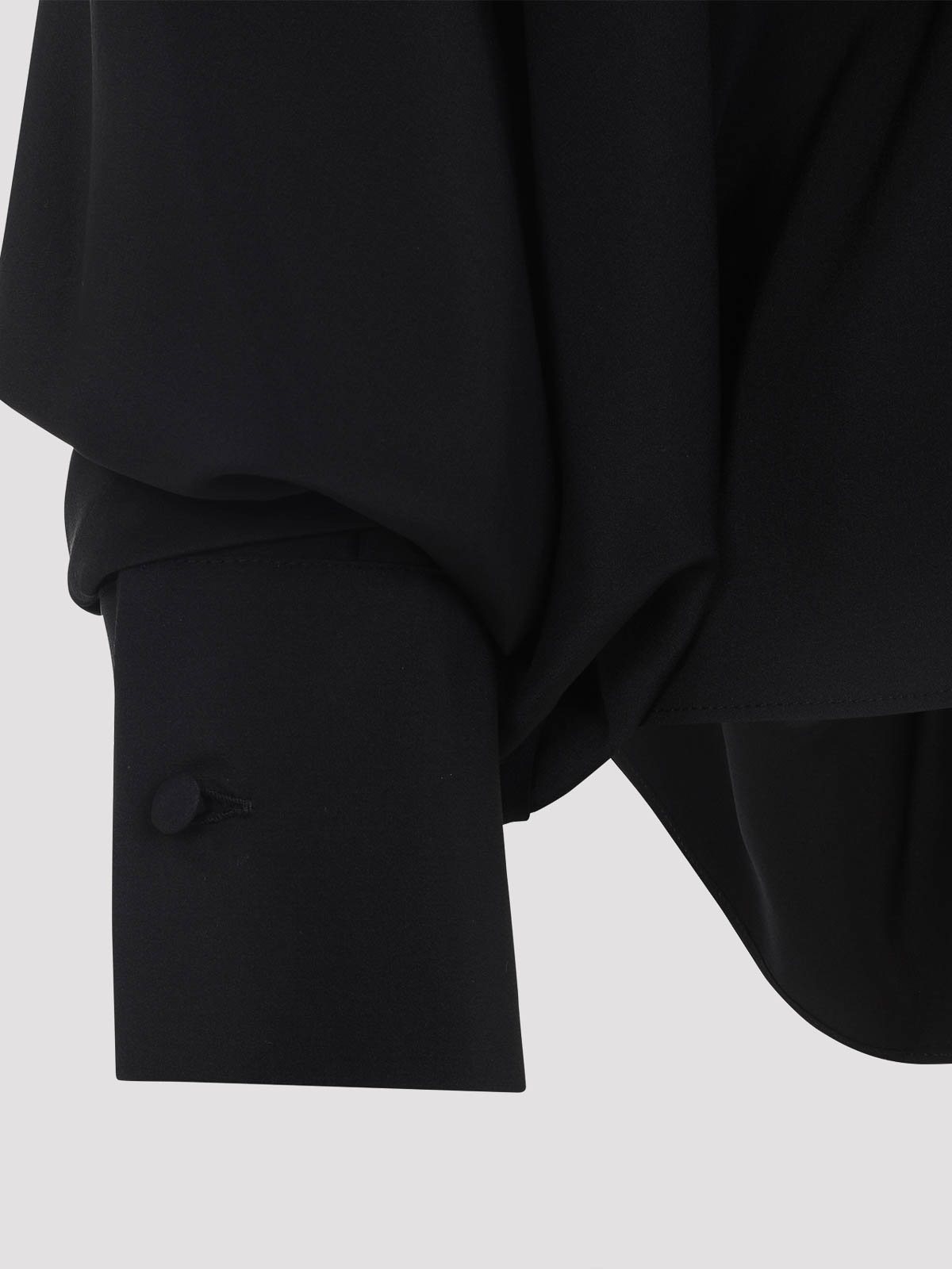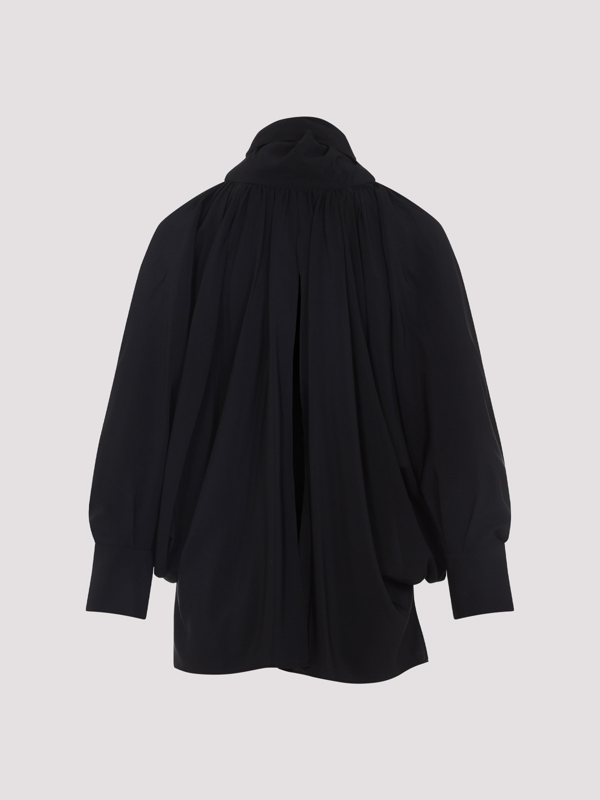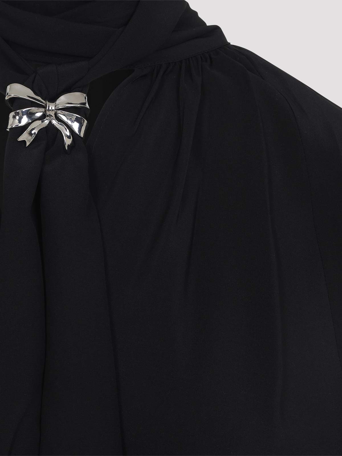 Max mara black silk leonida blouse. pure black silk blouse, v-neckline, self-tie fastening, front silver-tone metallic bow detail, back vent, balloon long sleeves, buttoned cuffs, asymmetric hem, tonal stitching.