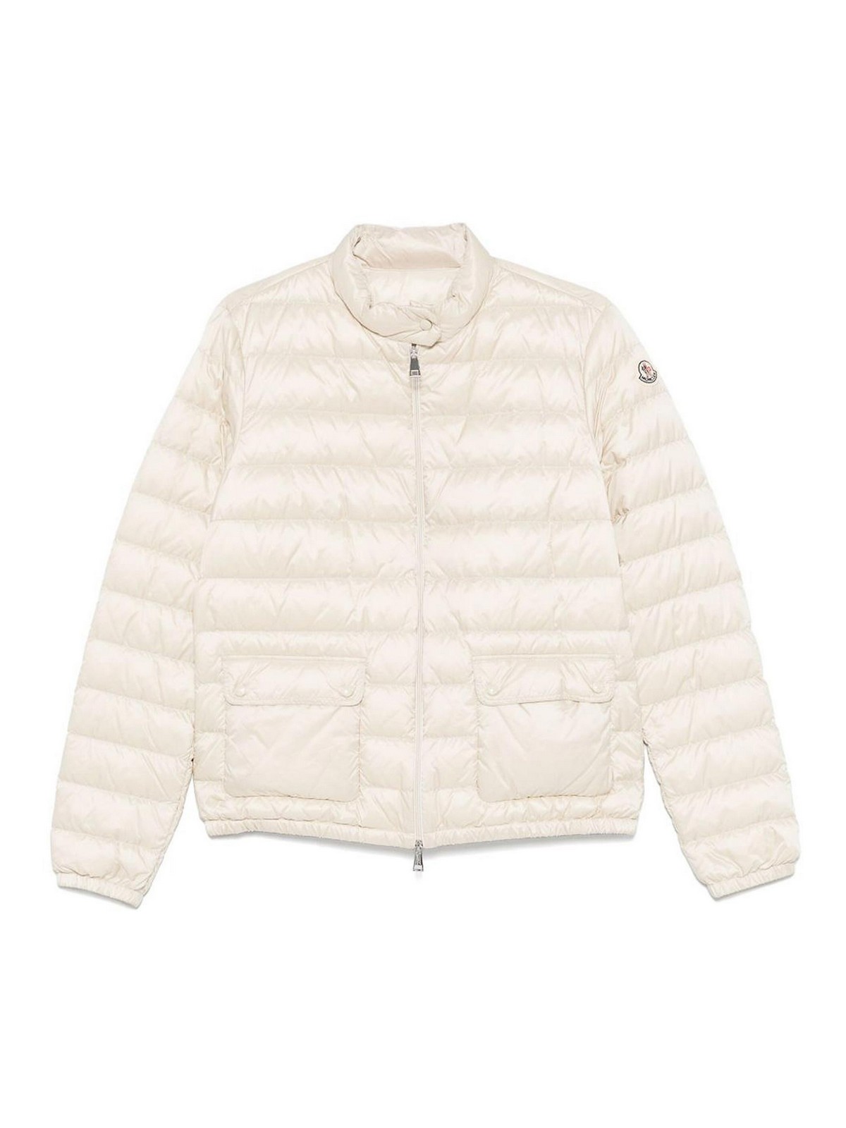 Light beige quilted down jacket by moncler with pockets and shoulder logo