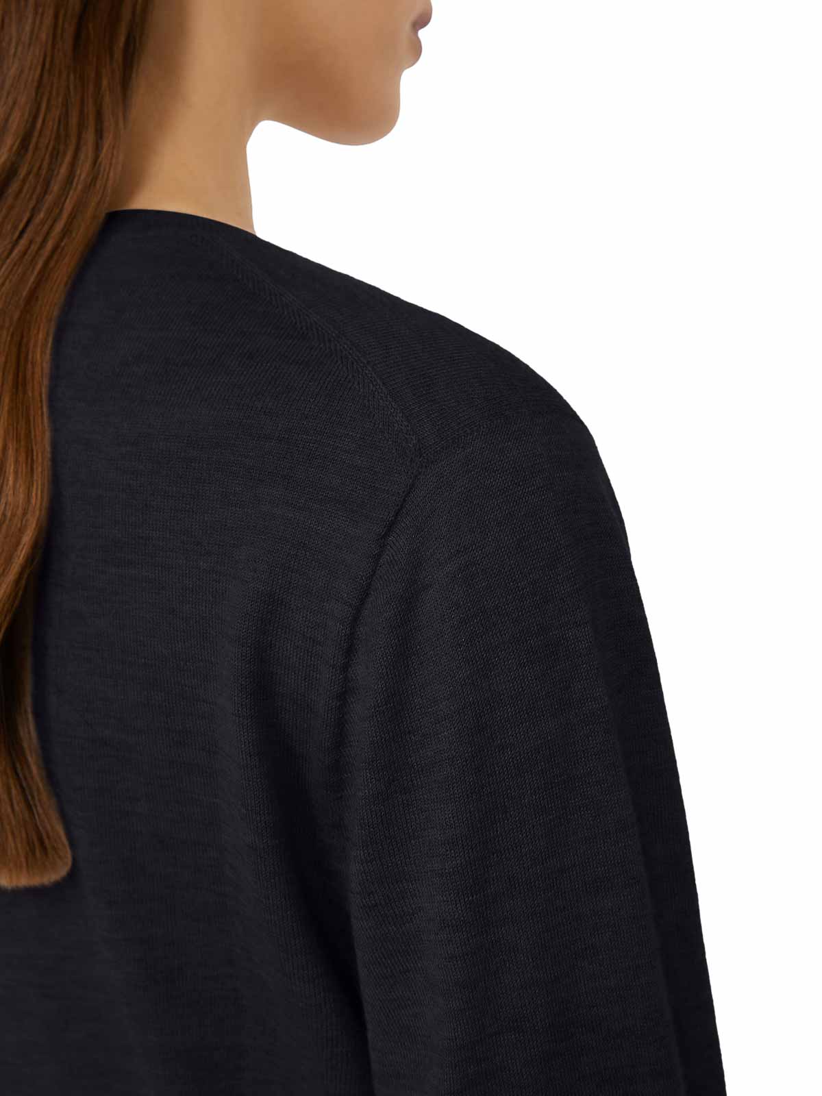 Lince sweater in satined cashmere yarn, lightweight pure cashmere sweater, regular fit, v-neck, long set-in sleeves, straight hem, ribbed edges, the model is wearing a size m and is 175 cm tall. her measurements are: waist 59 cm and hips 86 cm, color: black