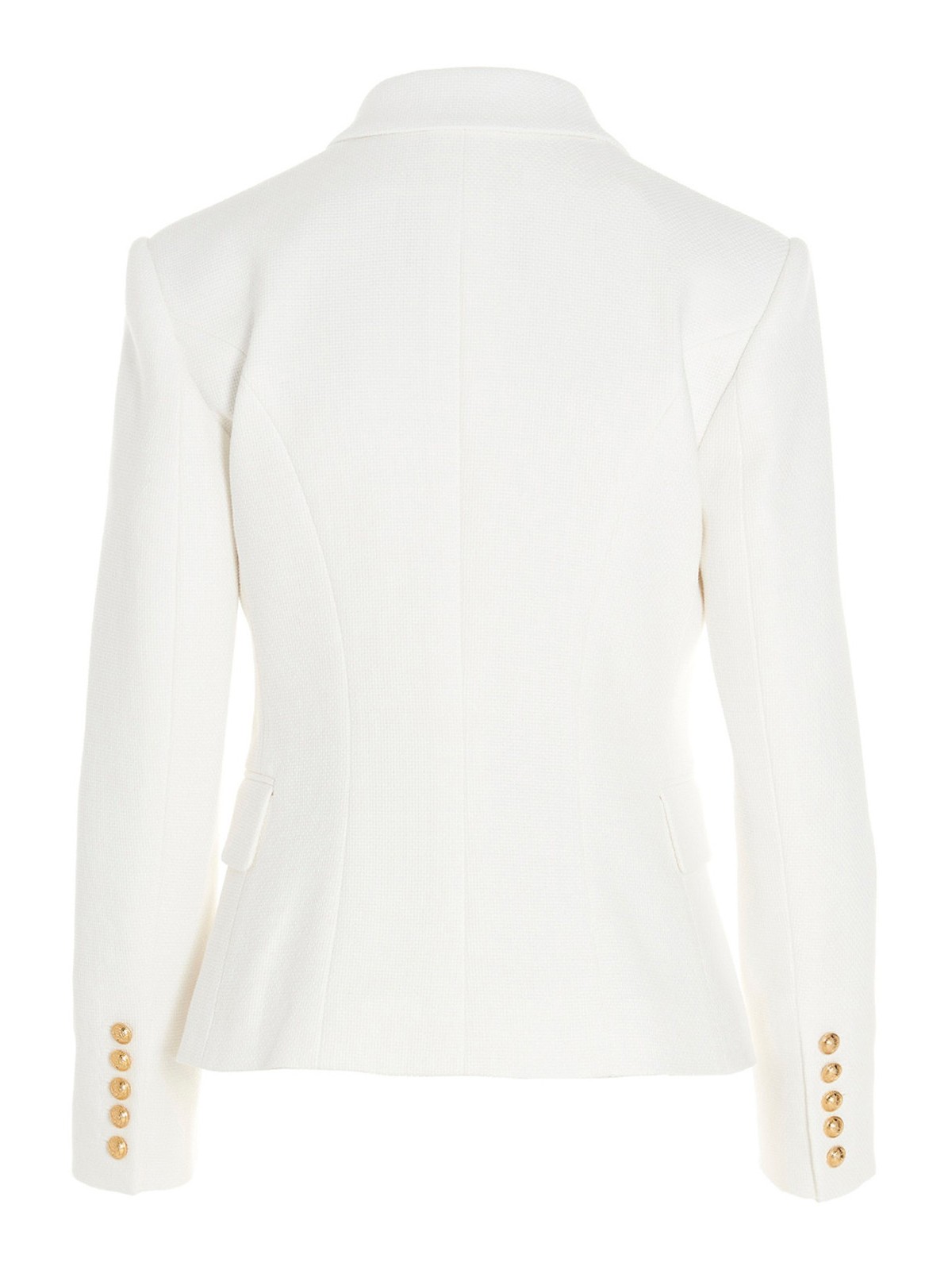 Cotton double breast blazer featuring a logo button closure, pockets, long sleeves and padded shoulders.