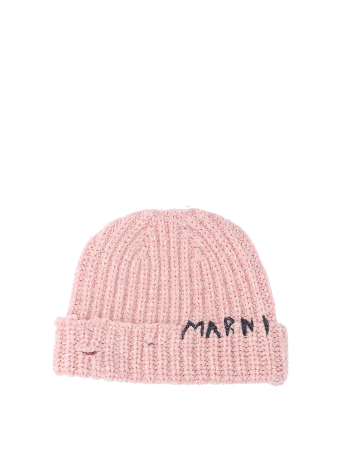 Marni logo beanie in pink wool with ribbed design and front black logo turn-up