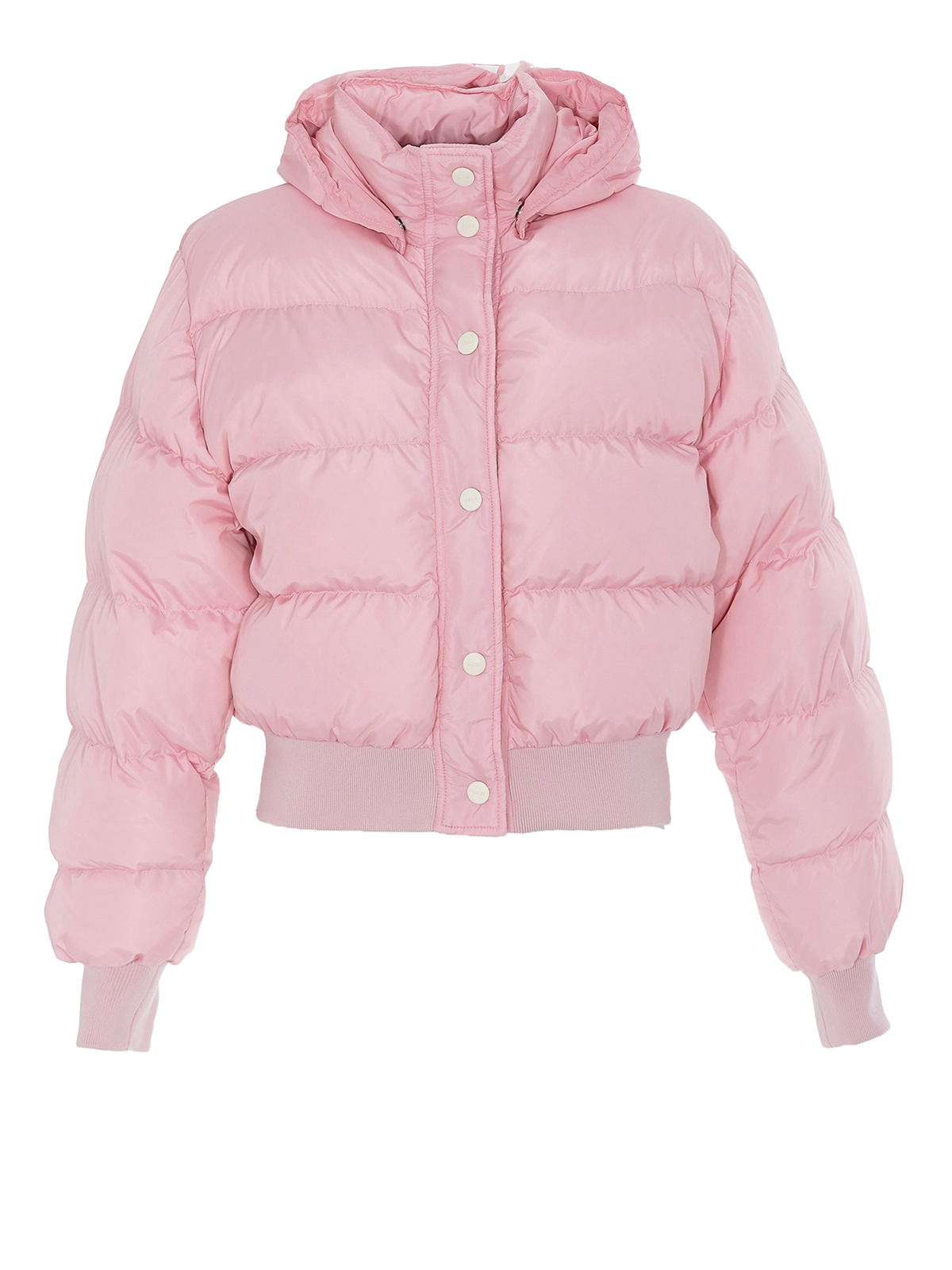 Nylon down crop puffer jacket detailed with removable logo hood, snap fastening, seam pockets, ribbed hem and cuffs. Regular fit.