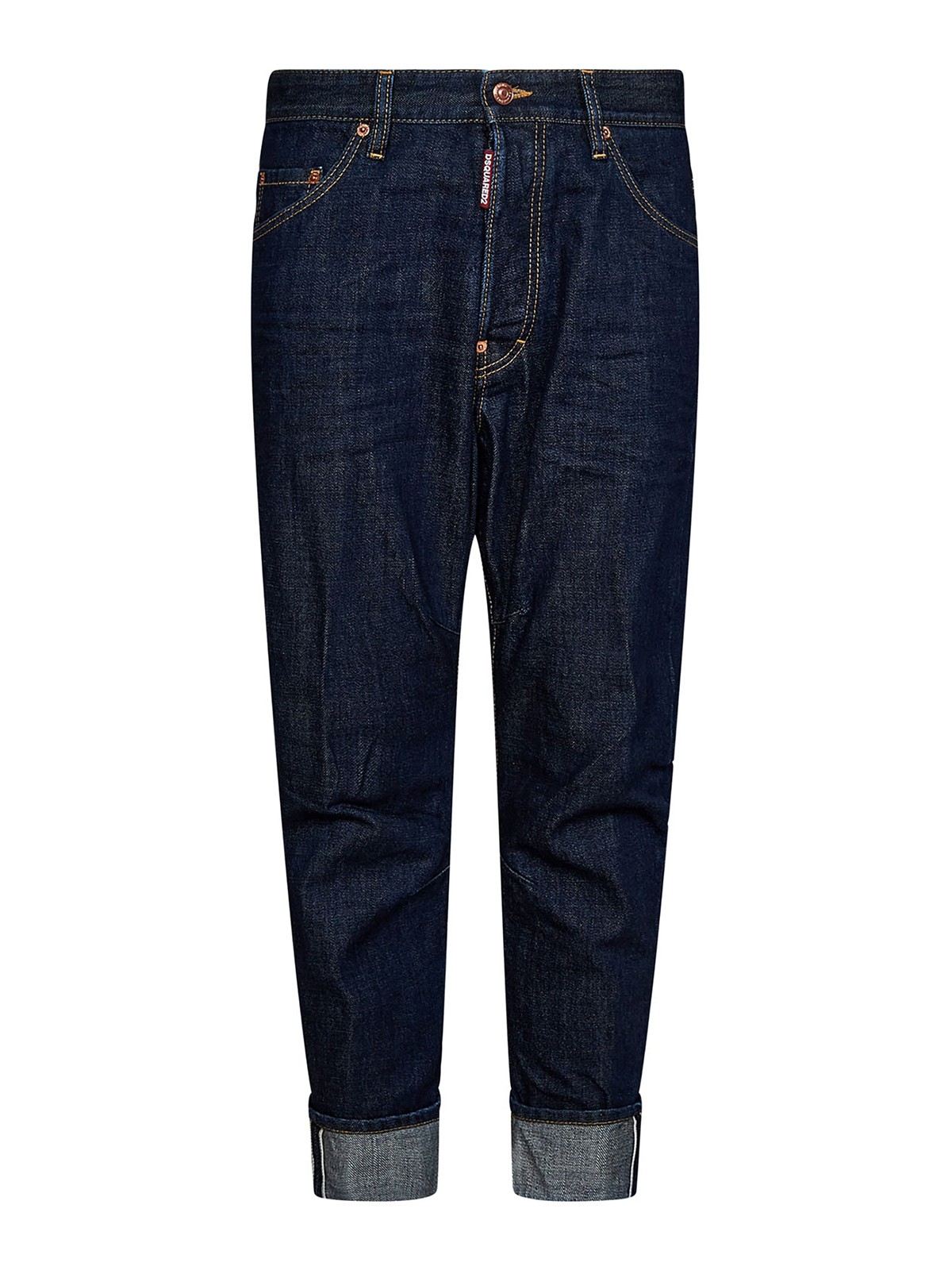 Front concealed button fly regular waist, low crotch, belt loops five pockets red logoed label at front, rear dsquared2 caten brothers leather patch cropped cut turn-up hem regular fit dark blue.