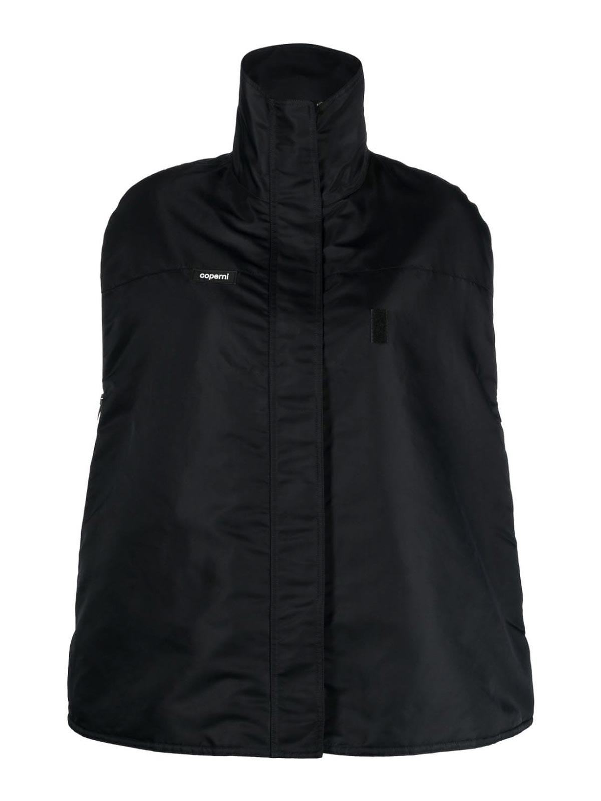Logo-patch bomber cape from coperni featuring black cape design logo patch at the chest funnel neck concealed two side zip- pockets and straight hem