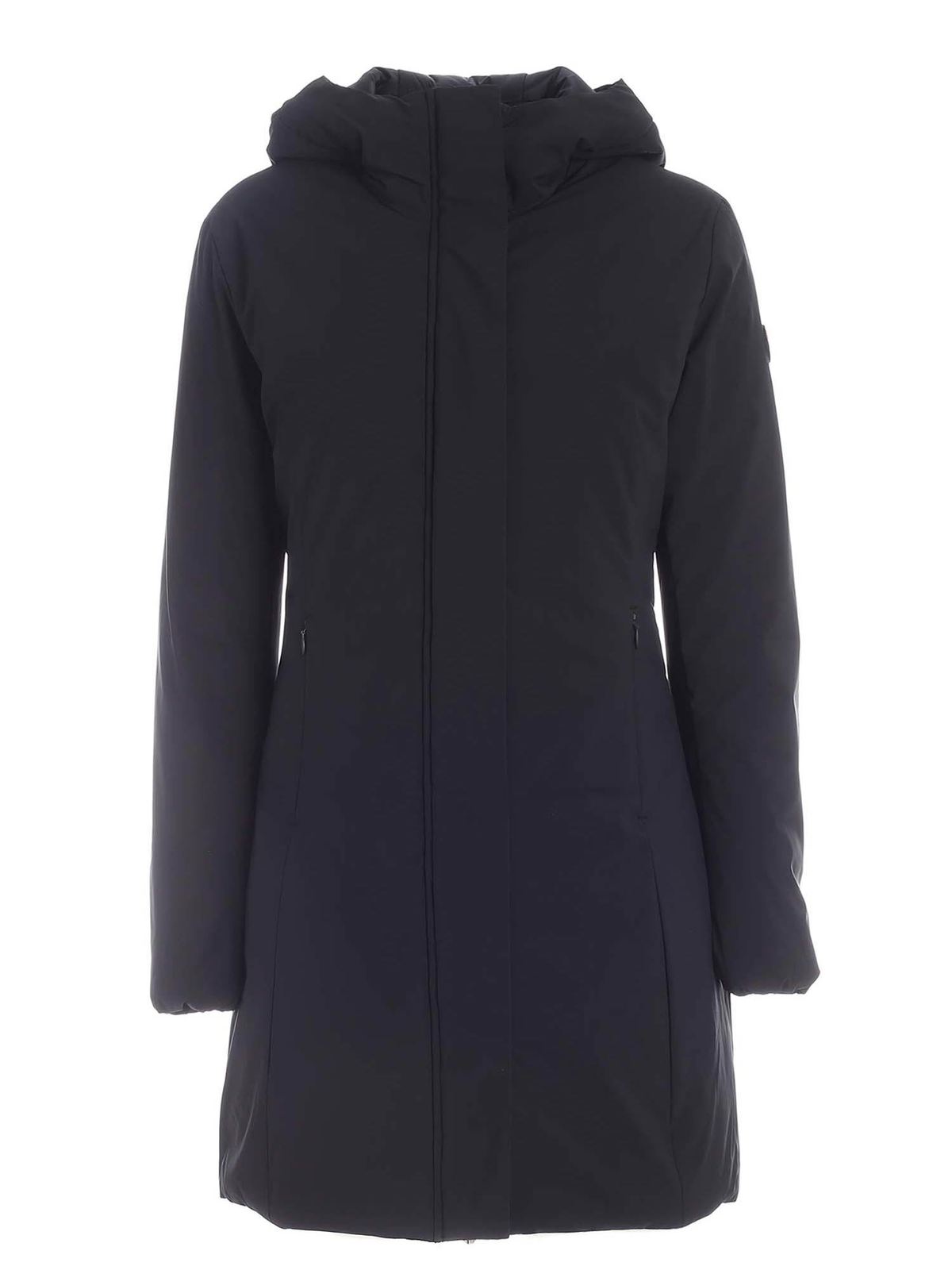 Hooded eco-friendly jacket detailed with synthetic padding, logo patch on the sleeve, invisible zip side pockets, waisted, hood drawstrings, double slider zip and hidden snap buttons fastening. Thermal index: warm (-5°/+10° C).