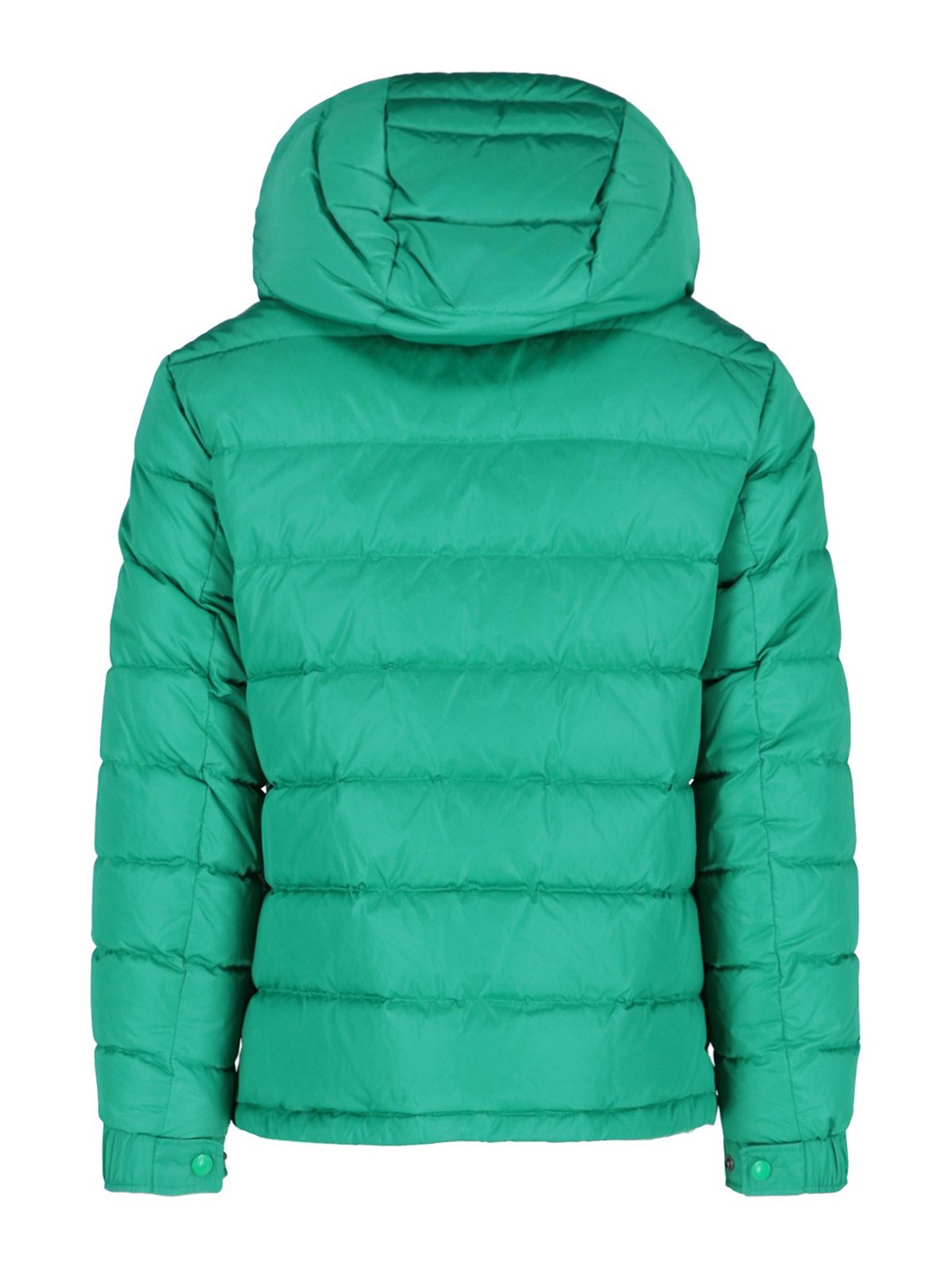 Logo down jacket, nylon, green, buttoned hood, zip fastening, adjustable cuffs, front logo patch detail, two side zip pockets, drawstring hem.