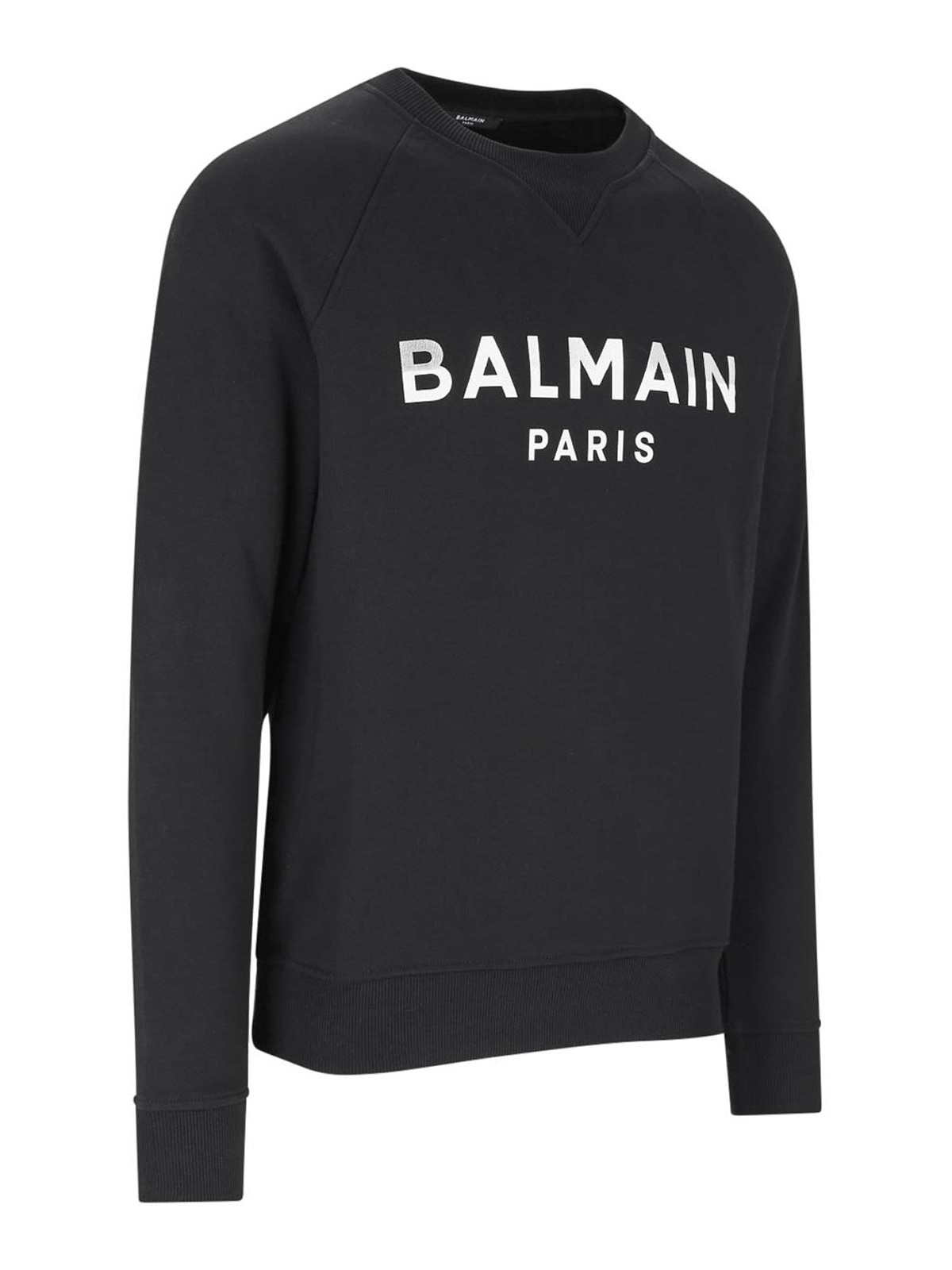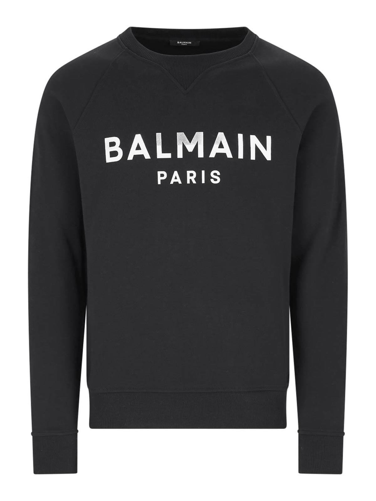 Balmain logo sweatshirt in black cotton crew neck white logo print on front ribbed trim straight hem