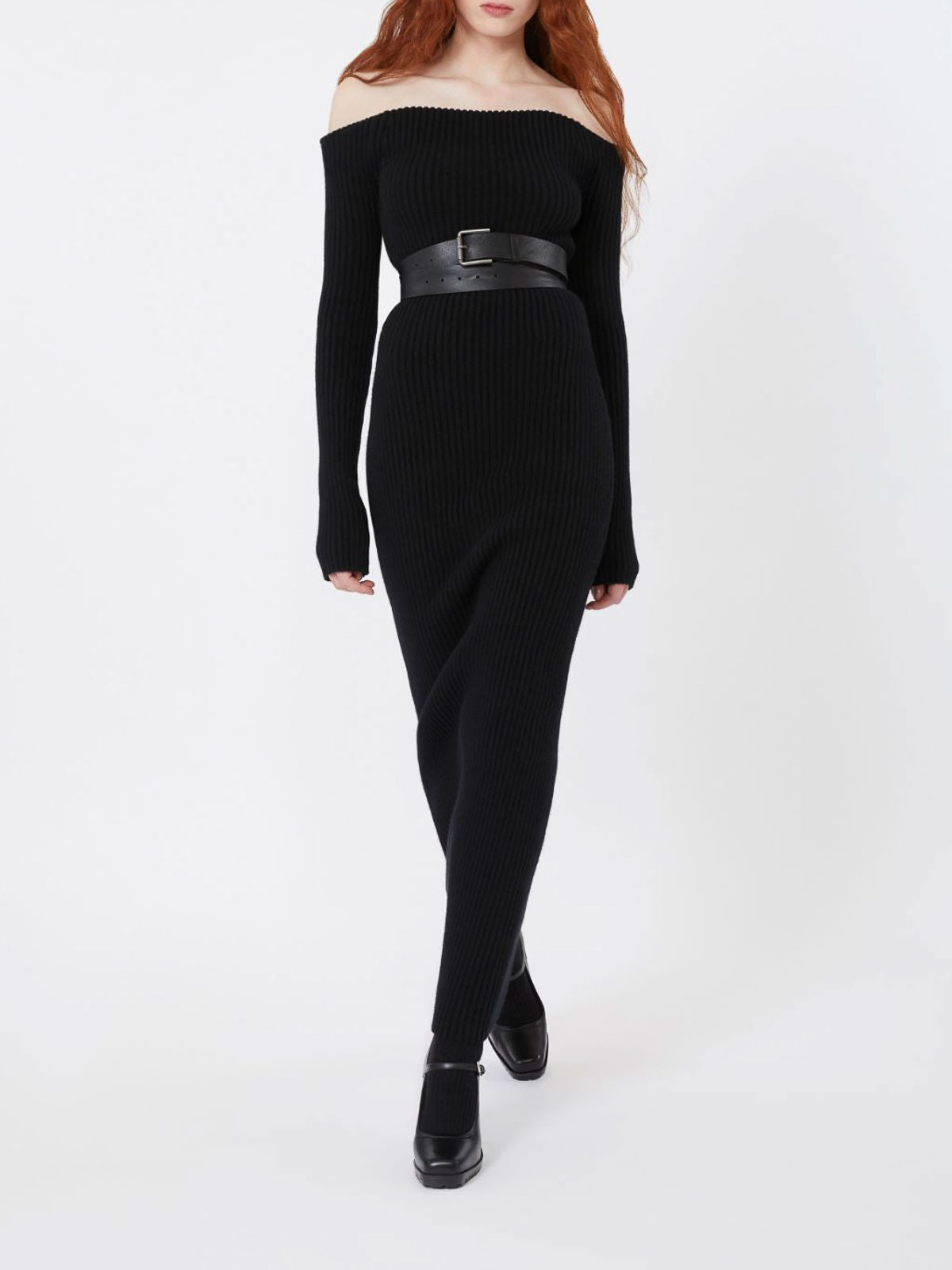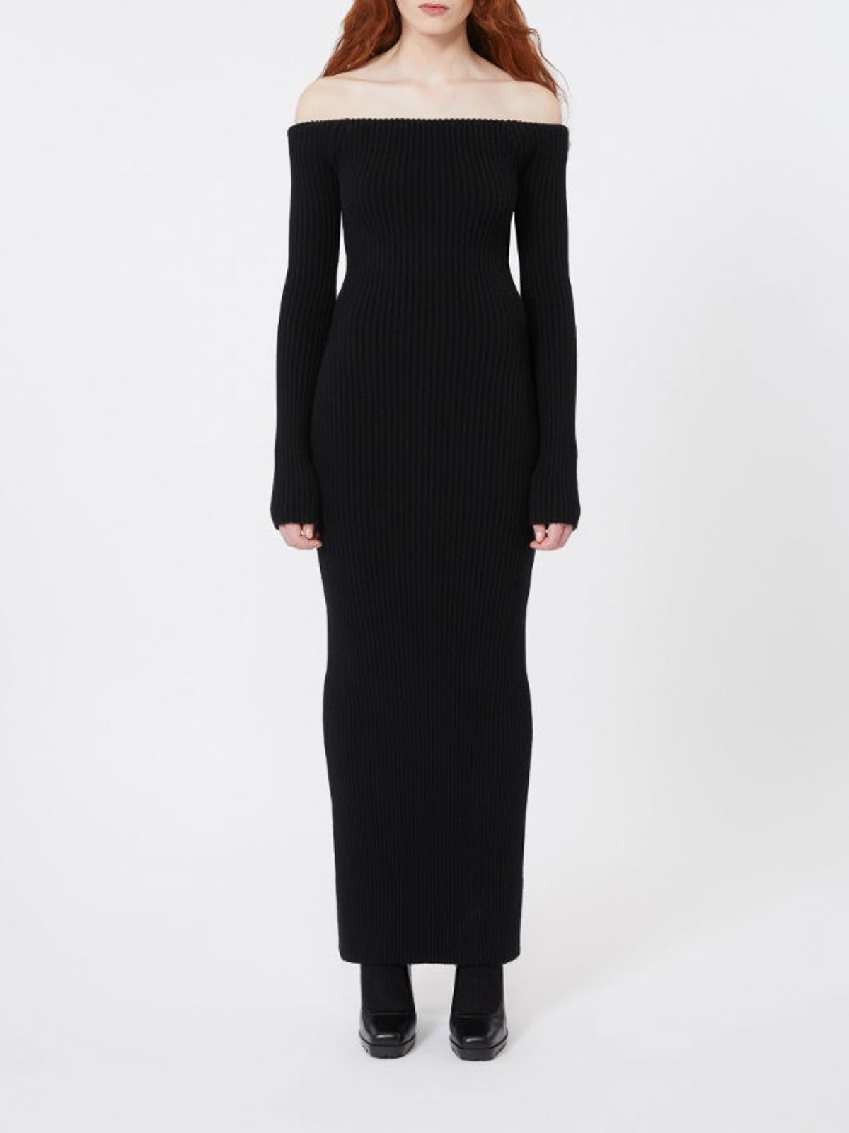 I dress Arnes long dress tight line straight neckline with shoulder discoveries