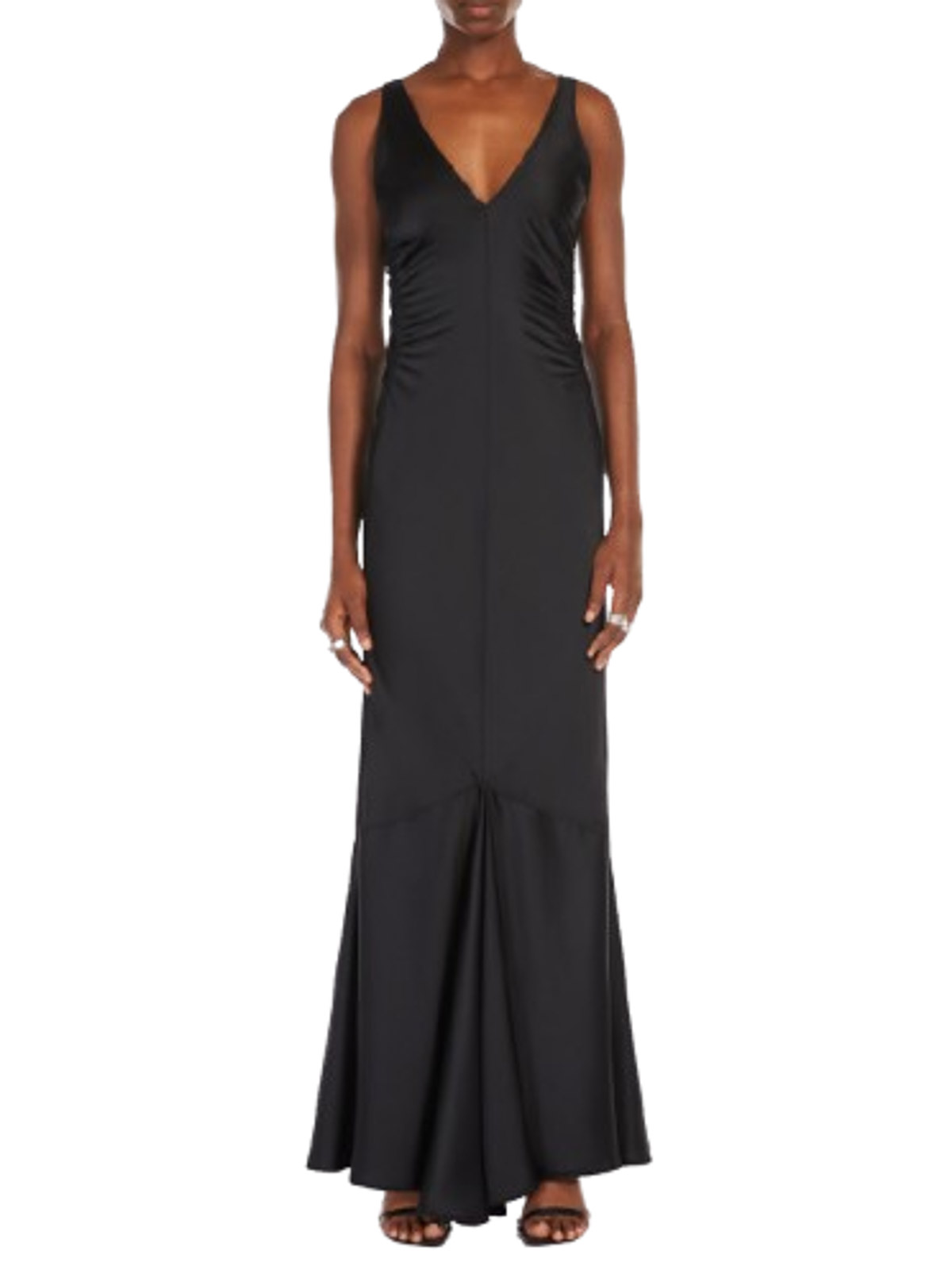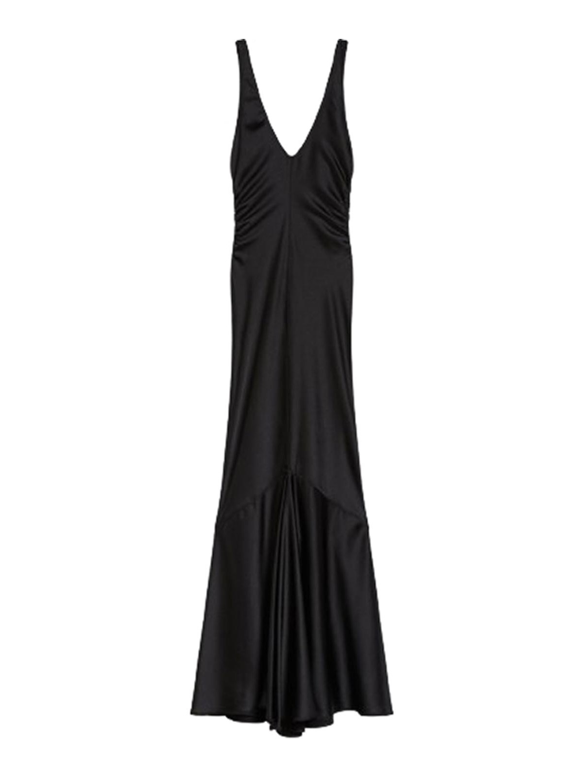 Long black satin dress, with a deep v-neckline on both the front and back. the sides are characterized by gathers that create movement on the bust. the bottom of the skirt with bias cut gives a mermaid line.