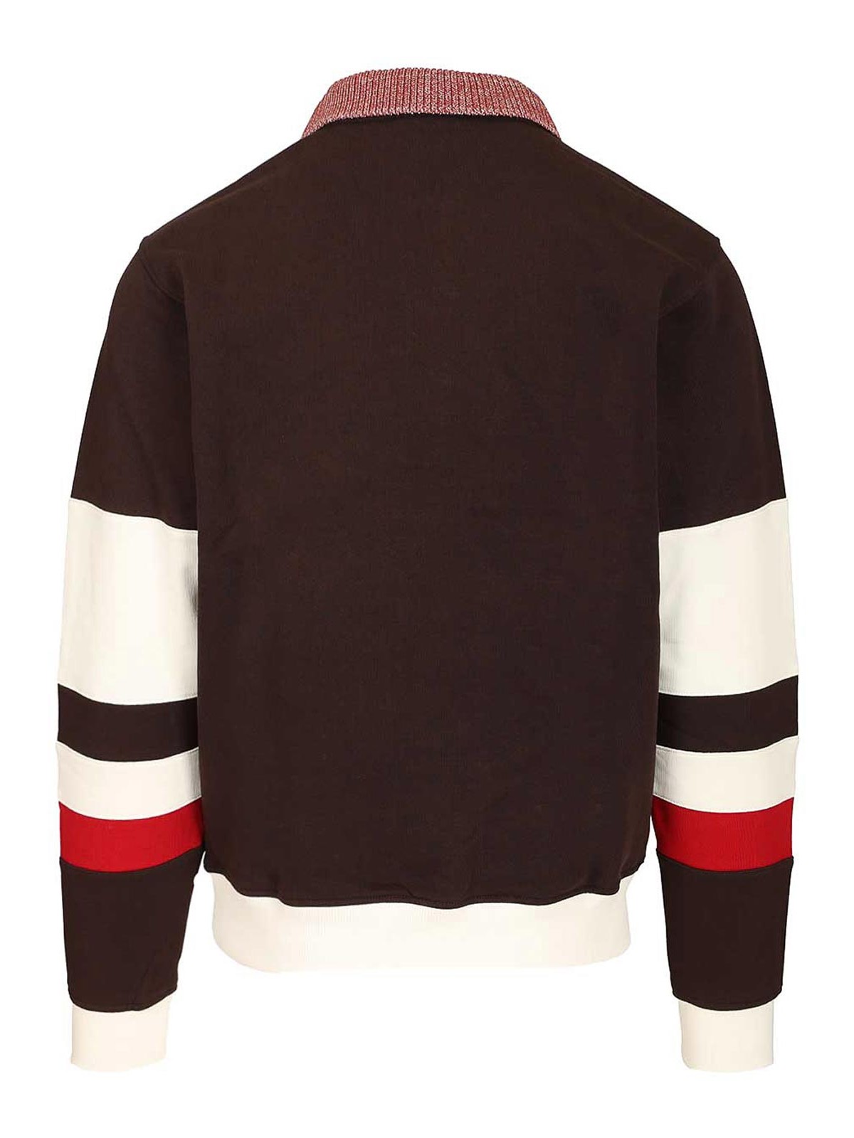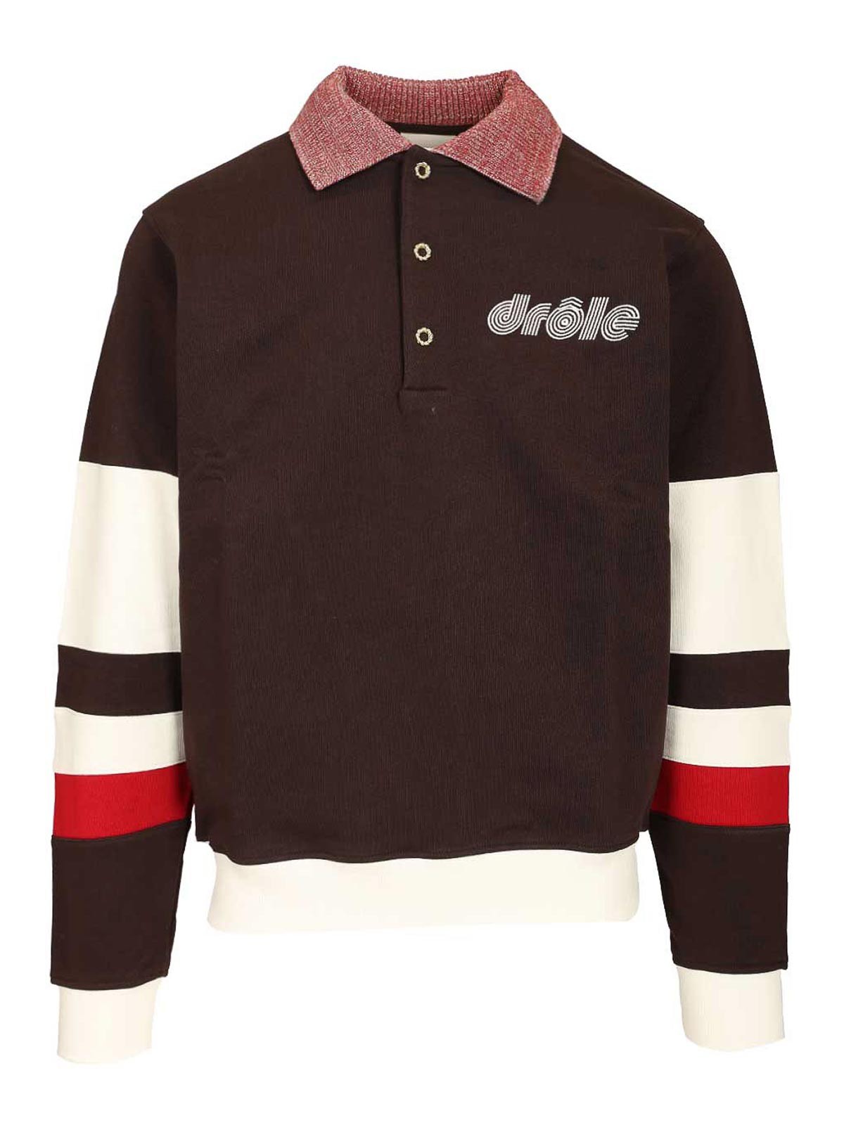 Dark brown long, sleeved polo shirt from drole de monsieur featuring drle on the chest contrasting on the sleeves a striped ribbed collar three torsades snap buttons and contrasting ribbed cuffs and hem