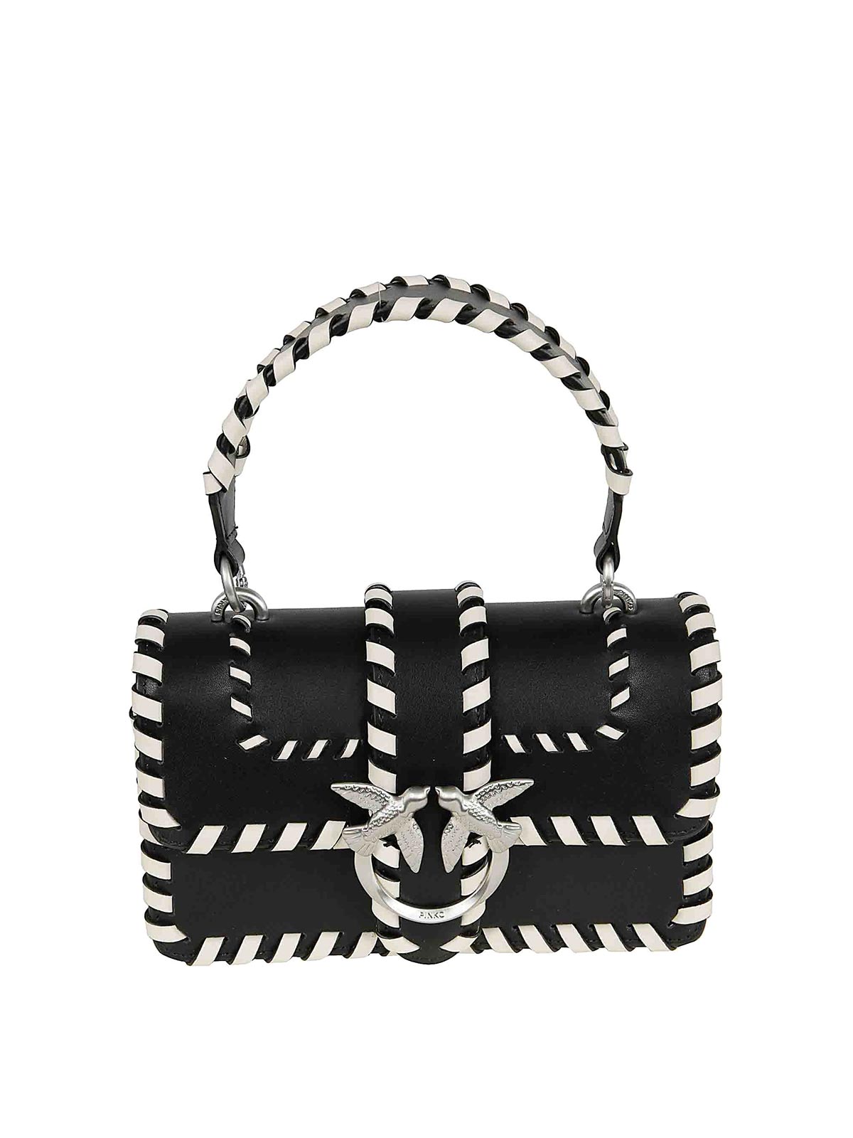 Mini Love Bag handbag in soft leather by Pinko, with a flap and button closure, main interior zip closure, leather handle and shoulder strap for carrying by hand or on the shoulder. Featuring two-tone threading and a diamond-cut Love Birds buckle.