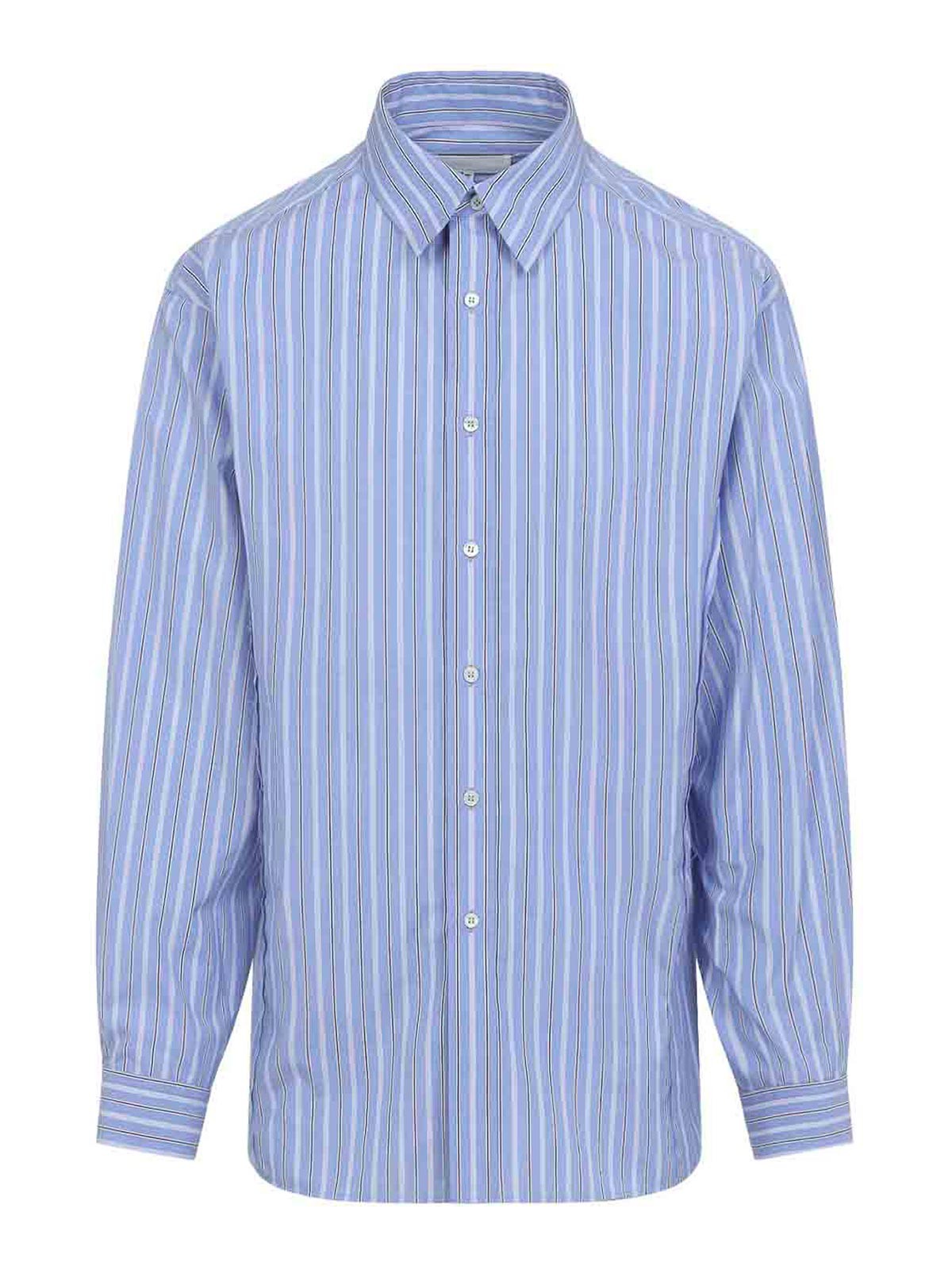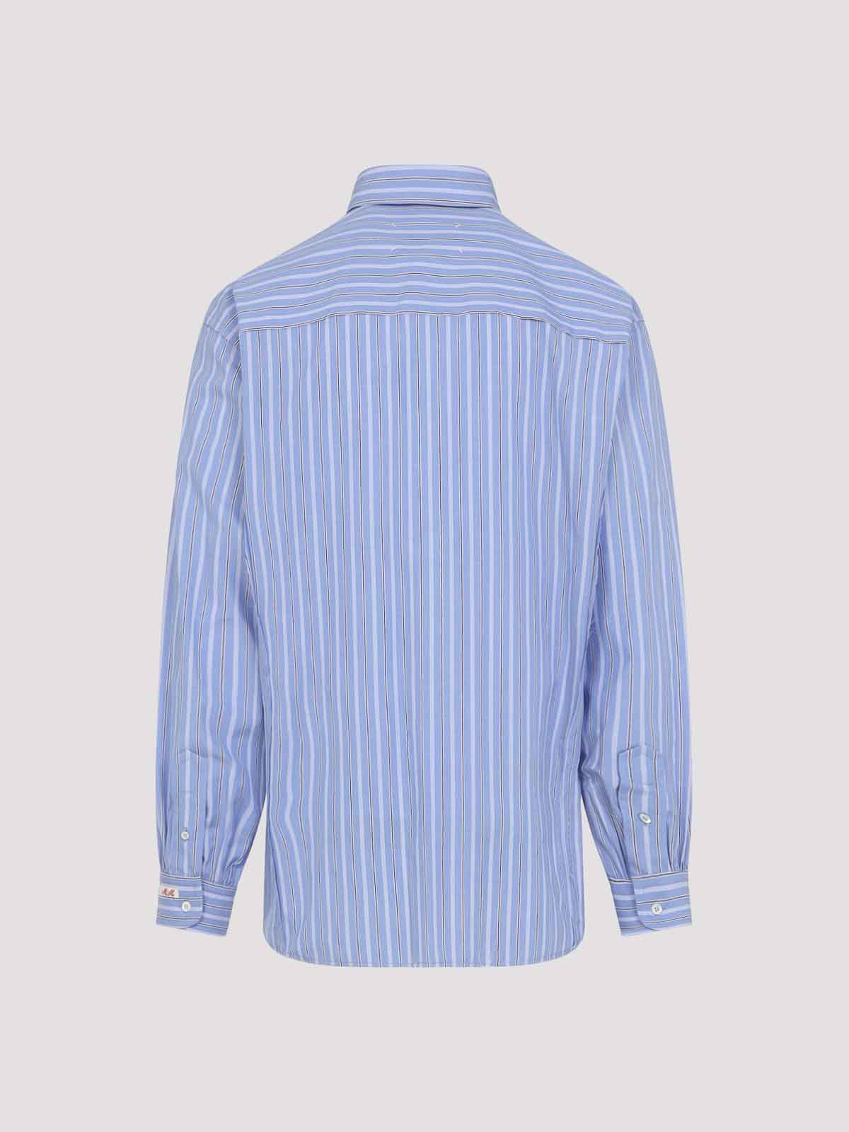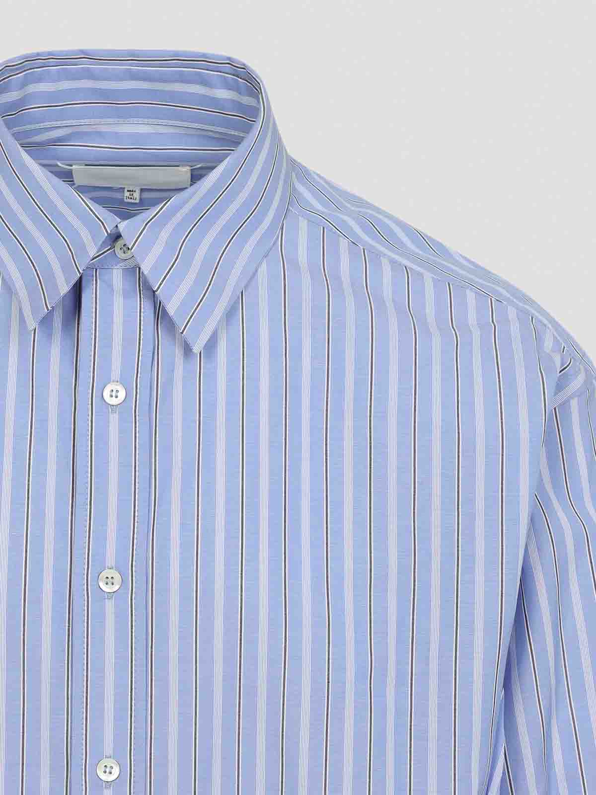 Maison margiela ls light blue shirt crafted from light blue striped poplin pointed collar button long sleeves buttoned cuffs white signature stitching at the back yoke round hem